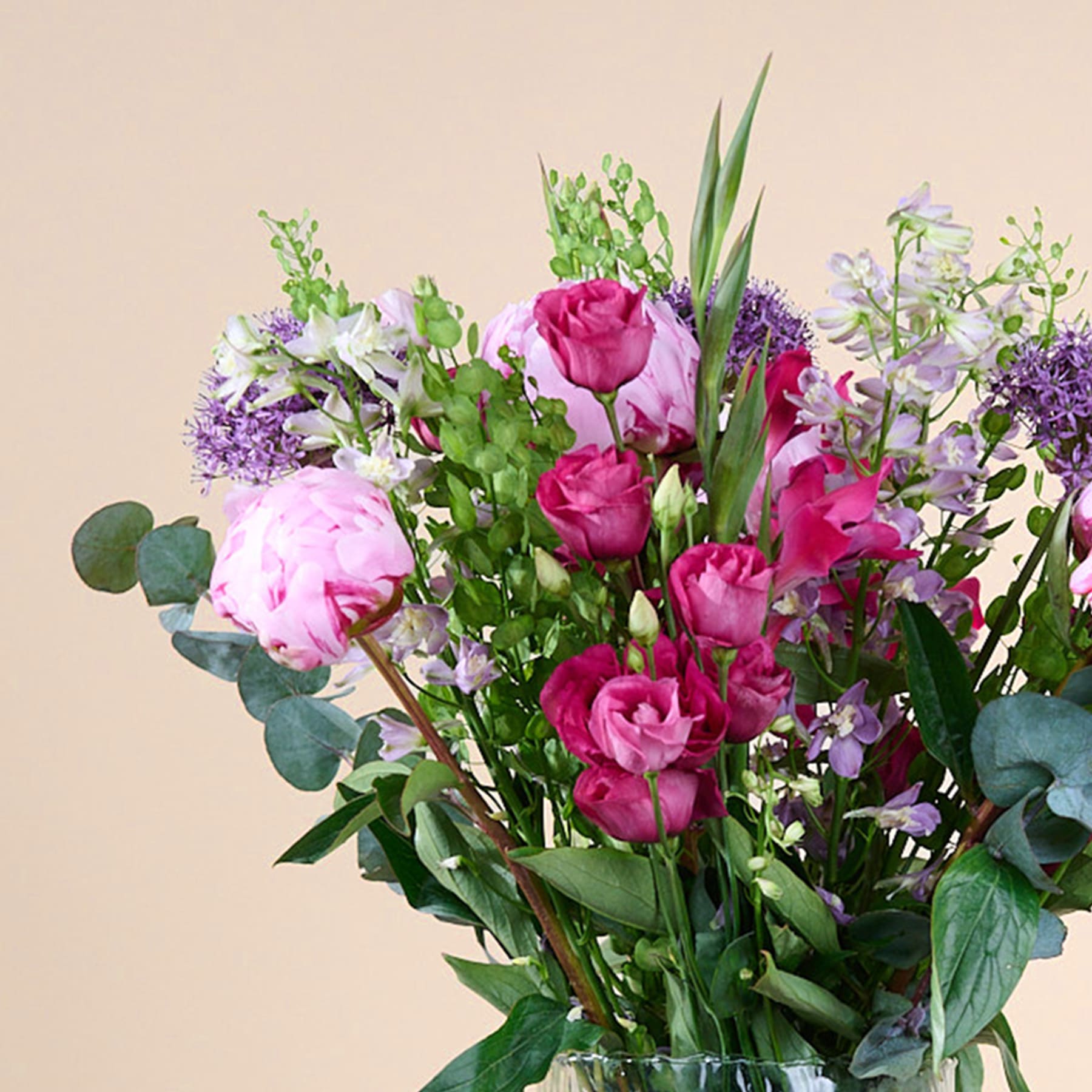 Kannst du dich noch an die Zeit erinnern, als du für deine Mama die schönsten Blumen direkt von der Wiese gepflückt hast? Wie groß war da die Freude! Mit unserem hübschen Wiesenstrauß Blütenfreude möchten wir dir dieses Gefühl zurückbringen. Das bunte Arrangement enthält kugeligen Allium, prachtvollen Rittersporn, Eustoma, beeindruckende Gladiolen sowie niedliches Hirtentäschelkraut und üppige Pfingstrosen. Letztere verfügen über prall gefüllte Blütenköpfe und sind an Schönheit kaum zu überbieten. Dekorative Eukalyptuszweige verleihen dem Wiesenstrauß einen passenden Rahmen. Mit einem Durchmesser von etwa 32 cm und einer Stiellänge von ca. 50 cm ist das Arrangement eine echte Augenweide. Die passende Vase, designed by BLUME2000, ist ebenfalls im Lieferumfang enthalten. Das hübsche Exemplar ist mundgeblasen und aus 100 Prozent Recycling-Glas gefertigt. Somit leistest du noch einen Beitrag zum Umweltschutz. Produziert wurde sie in Europa. Die Vase ist etwa 26,5 cm hoch und hat an der breitesten Stelle einen Durchmesser von ca. 19 cm. Über dieses Geschenk werden sich deine Lieben garantiert freuen!