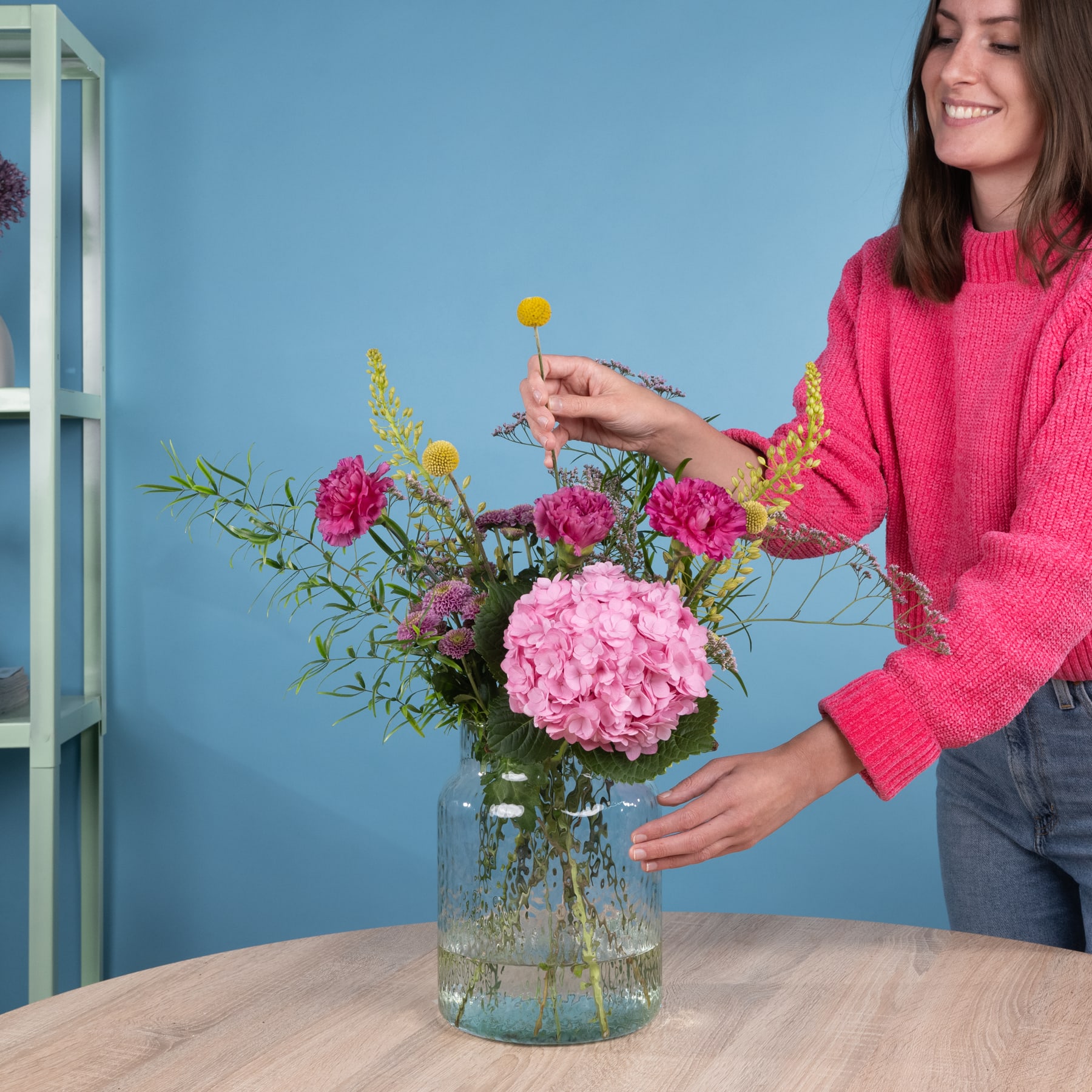 Lust auf Abwechslung und Kreativität? Dann lass dir unsere Blumenbox Pink Splash nicht entgehen. Die plastikfreie Box ist mit den schönsten Blumen ausgestattet, sodass du dir deinen Strauß ganz nach deinen Wünschen und Vorstellungen zusammenstellen kannst. Neben einer üppigen Hortensie in zartem Rosa enthält sie eine traumhafte Steppenkerze, kugelige Craspedia in Gelb, Nelken, Asparagus, Limonium und hübsche Chrysanthemen. Die Stiellänge beträgt jeweils 50 cm. Natürlich kannst du sie bei Bedarf beliebig kürzen. Die passende Vase, designed by BLUME2000, ist ebenfalls im Lieferumfang enthalten. Das hübsche Exemplar ist mundgeblasen und aus 100 Prozent Recycling-Glas gefertigt. Somit leistest du noch einen Beitrag zum Umweltschutz. Produziert wurde sie in Europa. Die Vase ist etwa 26,5 cm hoch und hat an der breitesten Stelle einen Durchmesser von ca. 19 cm. Blumenboxen sind übrigens auch eine tolle Geschenkidee. Das Arbeiten mit Blumen wirkt entspannend und macht einfach Spaß. Ist der Strauß dann fertig, kannst du dich ganz stolz zurücklehnen und den Anblick genießen. Teste es aus!