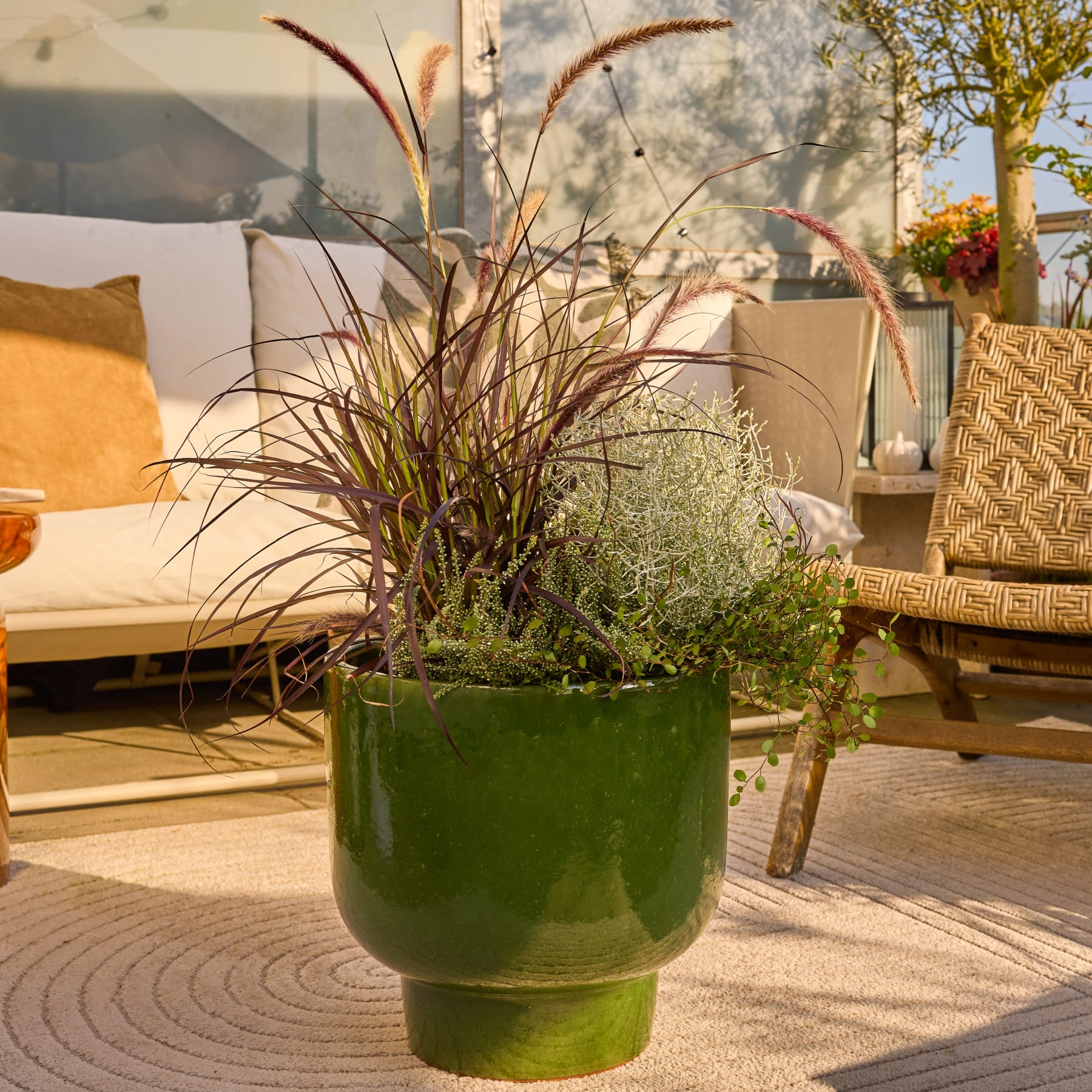 Mal eben schnell den Blumenkübel zum Herbst neu bepflanzen. Mal eben schnell? Und was für Pflanzen? Eigentlich wolltest du ja Gräser, aber Heide ist doch auch herbstlich und so etwas Rankendes wäre auch echt nice. Wie gut, dass es den Heidekaiser gibt – eine Zusammenpflanzung aus Calluna, Mühlenbeckia, Rubrum. Oder anders gesagt: Die Heide begeistert mit ihren Blüten, der Drahtwein rankt dekorativ herum und das Lampenputzergras verleiht mit seinen roten Blättern und den Blütenrispen das gewisse Extra. Da geht das Bepflanzen echt ruck zuck! Der Heidekaiser hat einen majestätischen Namen, macht dir aber nicht viel Arbeit. Ausreichend Wasser, dazu ein sonniger Standort, mehr braucht er nicht um munter zu wachsen.