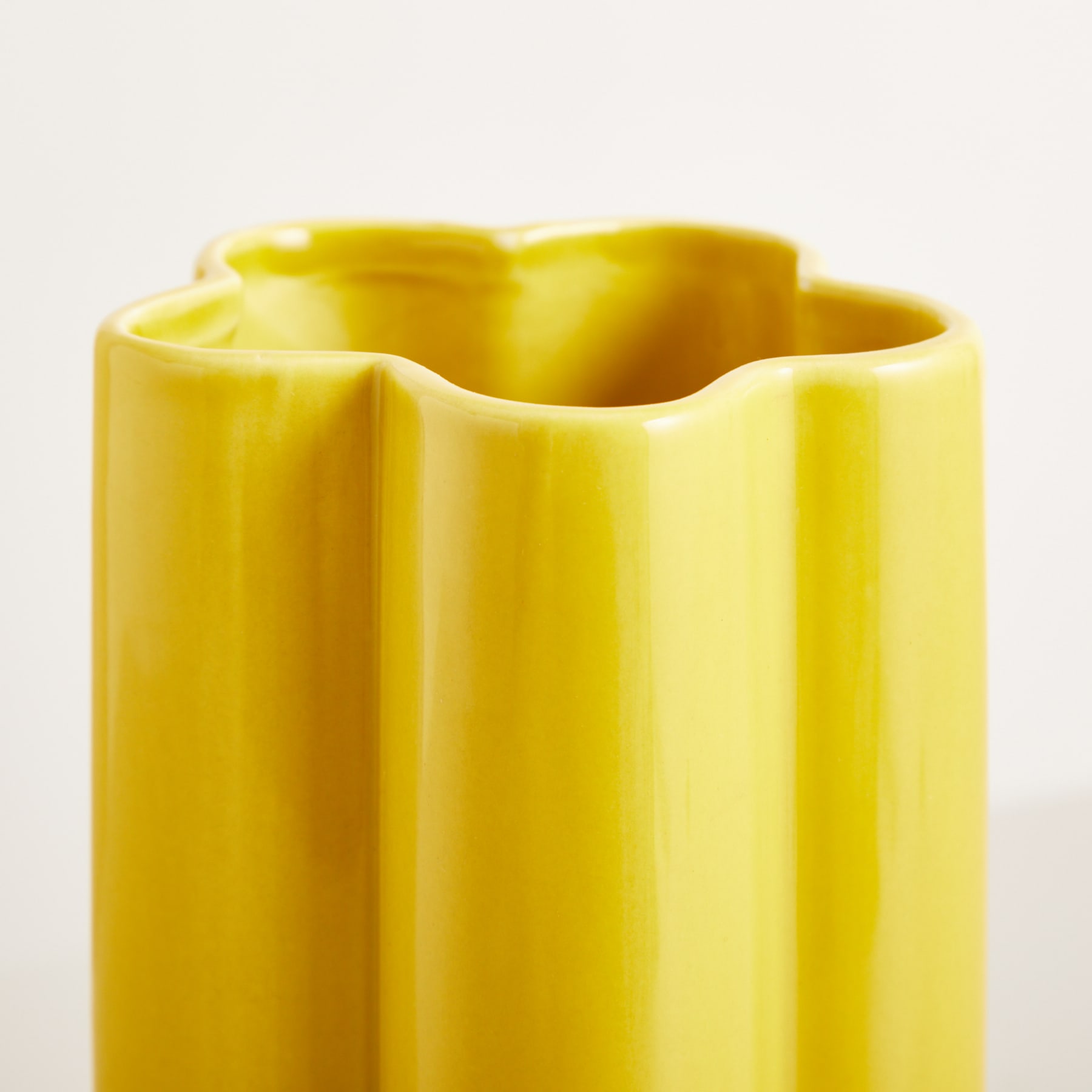 Die Keramik Vase in Gelb bringt sommerliche Frische in dein Zuhause. Mit den Maßen von 10 cm Breite und 18 cm Höhe eignet sie sich ideal für kleine Sträuße oder Trockenblumenarrangements. Gefertigt aus Keramik besticht die Vase durch ihre hochwertige Verarbeitung und eine glatte, elegante Oberfläche. Die fröhlich gelbe Farbe setzt leuchtende Akzente und sorgt für gute Laune in jedem Raum. Als vielseitig einsetzbares Dekorationsstück verbindet diese Vase Funktionalität mit einem modernen, angesagten Look.