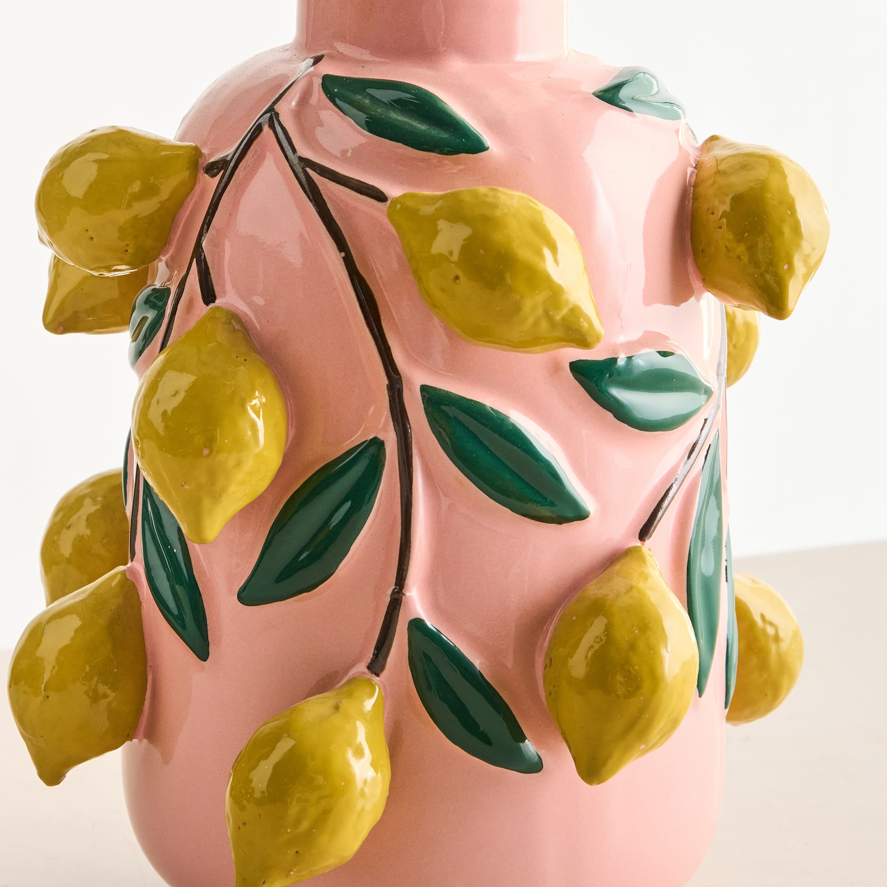 Diese Vase bringt mediterranes Flair direkt in dein Zuhause. Gefertigt aus hochwertiger Keramik und gestaltet in sanftem Rosa, wird sie durch kunstvolle Blütenranken und gelbe Zitronen, die plastisch hervortreten, zum absoluten Blickfang. Mit einer Breite von 21 cm und einer Höhe von 22,5 cm eignet sie sich ideal für frische Blumensträuße oder als dekoratives Einzelstück. Die lebendigen Farben und das frische Design verleihen jedem Raum eine sommerliche Leichtigkeit. Ob auf dem Esstisch, einem Regal oder einer Kommode – diese Vase sorgt für eine stilvolle Atmosphäre und bringt einen Hauch von Urlaub in deine vier Wände. Perfekt, um dein Zuhause auf einfache Weise aufzuwerten.