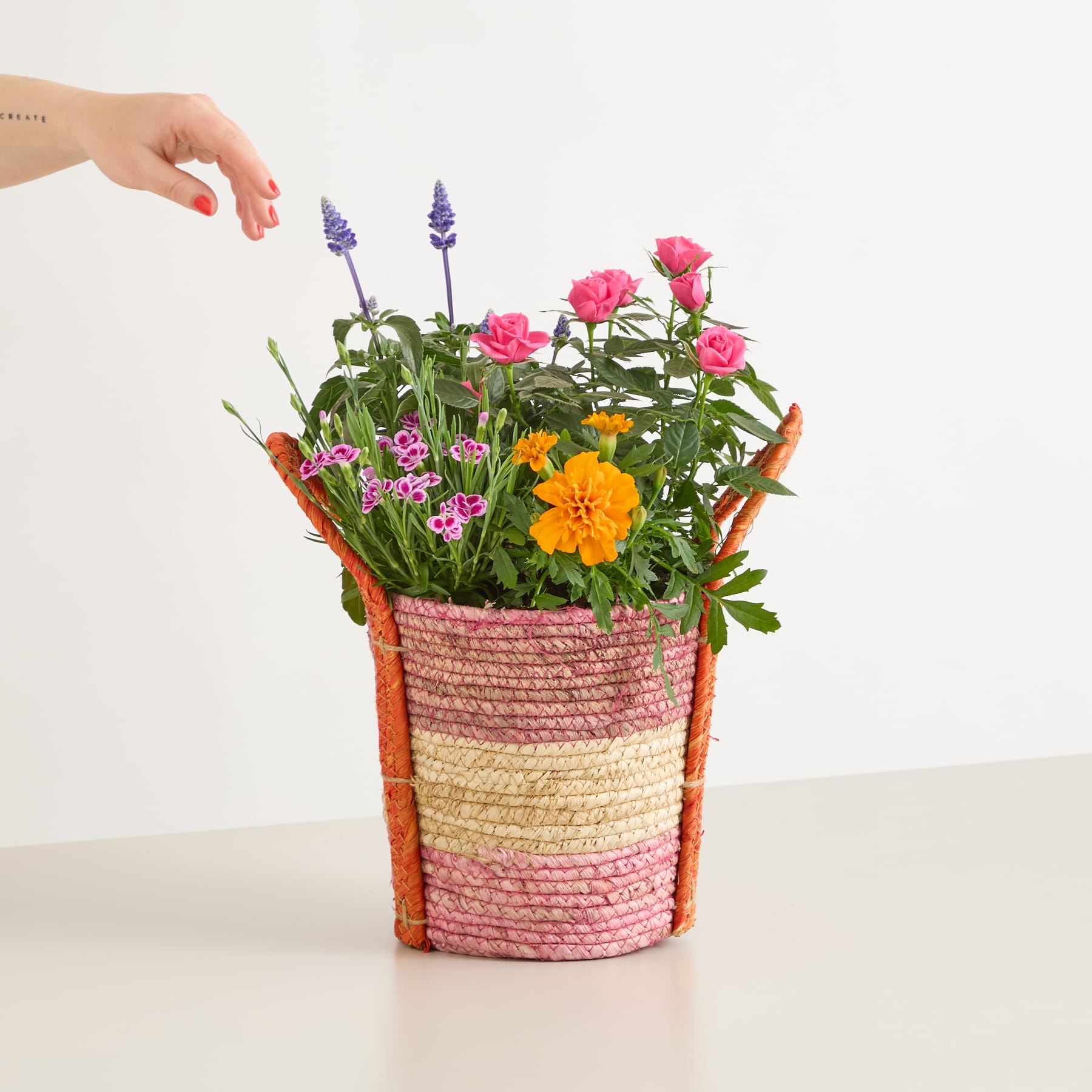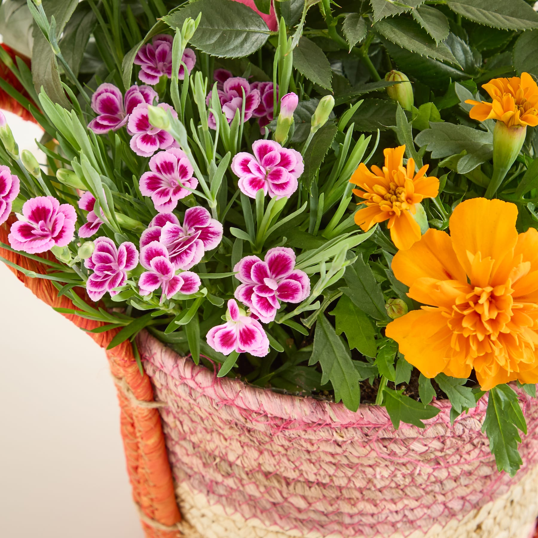 Hurra, es ist Sommer! Endlich können wir uns wieder an blühenden Pflanzen erfreuen. Wird es da nicht Zeit, Balkon und Terrasse ein wenig aufzuhübschen? Mit unserem Topfarrangement Color Crush ist das kein Problem. Es hat eine Wuchshöhe von etwa 40 cm und eine Topfgröße von 19 cm. Bepflanzt ist der dekorative Korb mit niedlichen Nelken, Tagetes, Salvia und einer eleganten Rose. Das leuchtende Farbspiel bringt gute Laune und macht Lust auf den Außenbereich. Dein Lieblingsmensch würde sich sicherlich auch gerne daran erfreuen. Also, warum nicht einfach Freude verschenken? Es braucht keinen bestimmten Anlass, um andere zu überraschen. Wir bringen das Topfarrangement für dich direkt zum Empfänger!