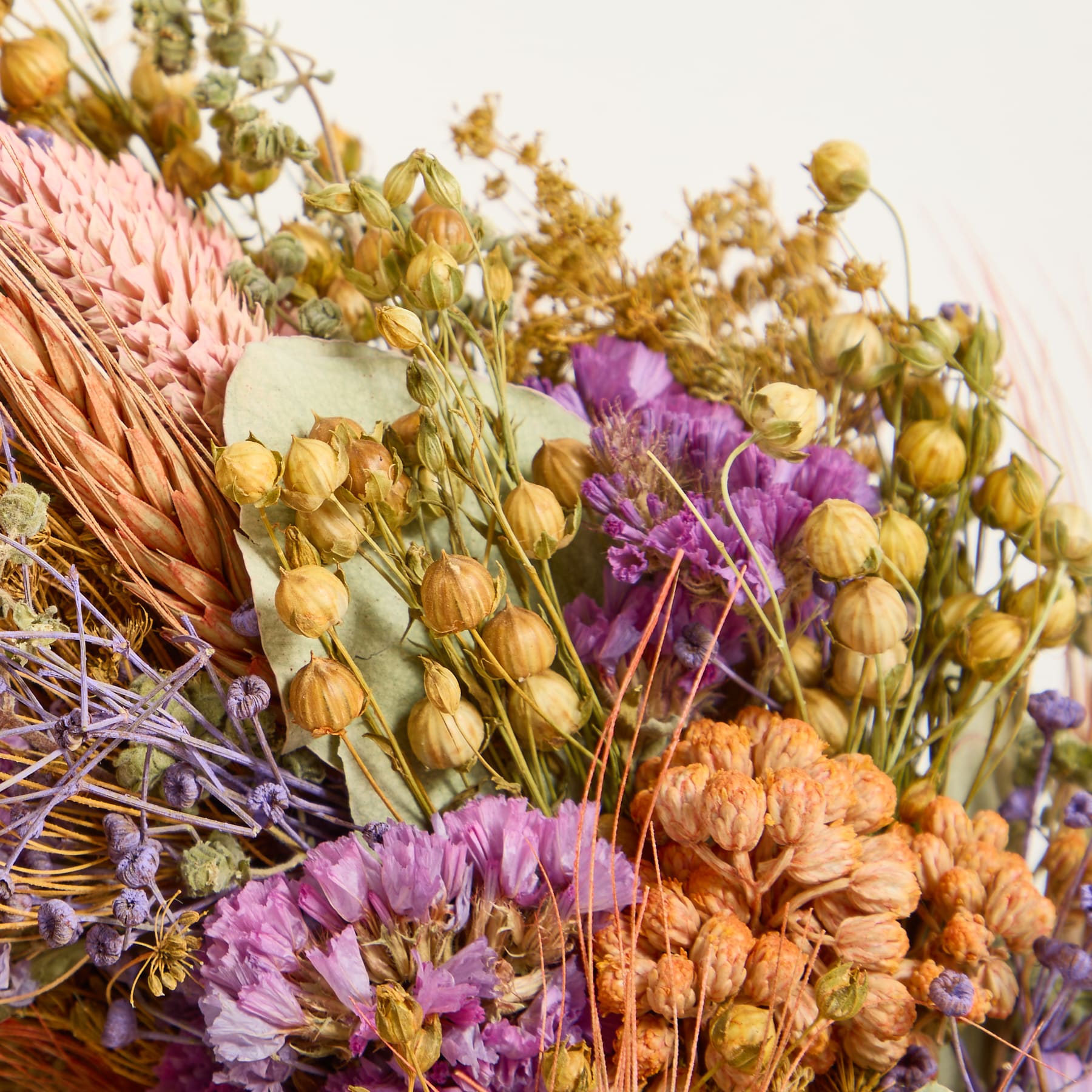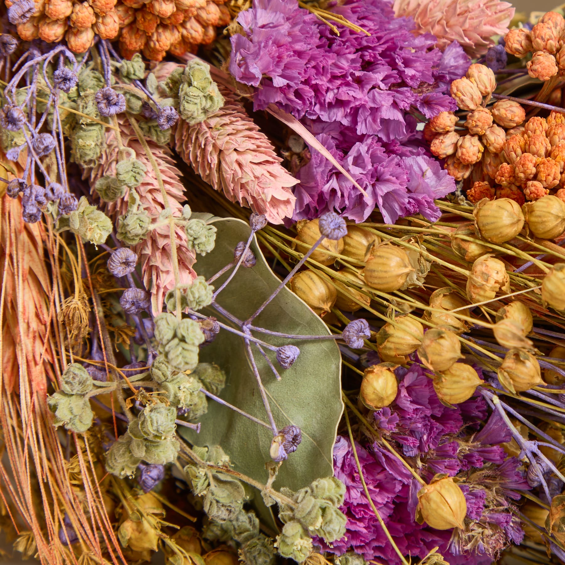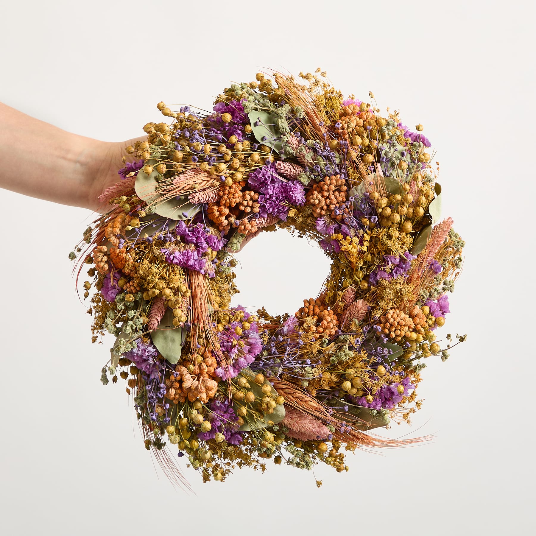 Der Trockenblumenkranz Lila Orange verbindet natürliche Materialien mit einer harmonischen Farbkombination aus Lila, Rosa, Grün und Orange. Dieser Deko Kranz ist als Türkranz ein wunderbares Highlight für deine Herbstdeko und schafft eine einladende, warme Atmosphäre. Mit einem Durchmesser von 25 bis 30 cm fügt er sich elegant in jede Einrichtung ein, ohne zu viel Raum einzunehmen. Suchst du nach einer stilvollen Möglichkeit, deinem Zuhause einen frischen herbstlichen Akzent zu verleihen? Der Trockenblumenkranz Lila Orange ist genau das richtige Element für eine gemütliche Jahreszeit voller Farbe und Natürlichkeit.