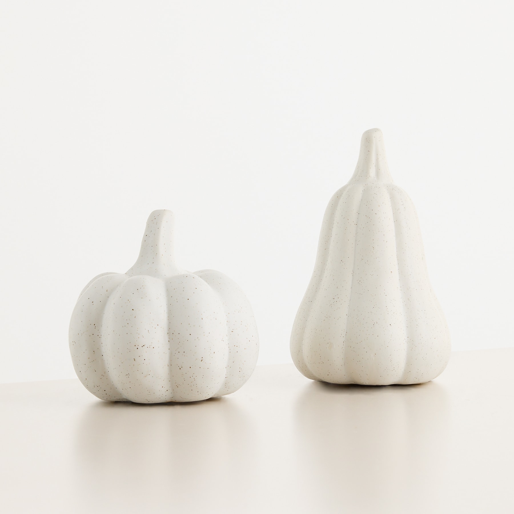 Die Deko Keramik Kürbisse Weiß Groß 2er-Set sind eine elegante Ergänzung jeder Herbstdeko. In zurückhaltendem Weiß gesprenkelt und mit einer angenehm glatten Oberfläche sind sie ein moderner Hingucker. Mit Maßen von 13 cm und 12,5 cm Durchmesser sowie Höhen von 13 cm und 15 cm bringen sie Größe und Präsenz in deine Deko – ideal für Sideboards oder als Teil eines herbstlichen Tischarrangements. Diese Kürbisse setzen auf Understatement statt Überladung und passen perfekt zu einem cleanen Wohnstil. Sie wirken hochwertig, zeitlos und setzen stimmige Akzente in der Übergangszeit.
