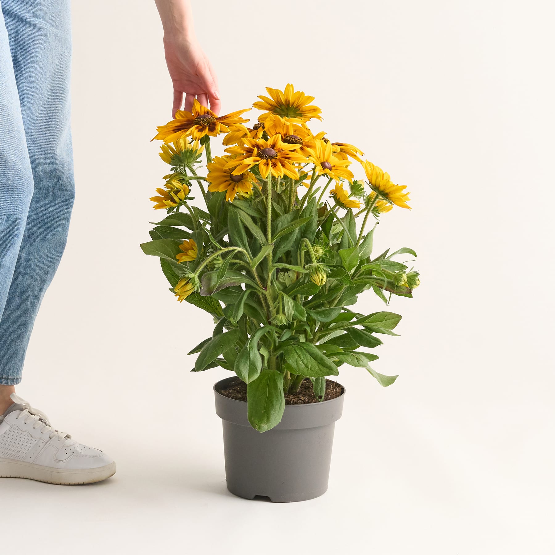 Groß, golden, leuchtend – so zeigt sich der Sonnenhut 'Sunbeckia® Alicia' Gelb/Orange. Die Sorte Rudbeckia hirta begeistert mit stabilen Blütenstielen, leuchtendem Farbverlauf und einer besonders langen Blütezeit. Sie liebt es sonnig und dank ihrer kräftigen Wuchsform bleibt sie selbst bei Wind und Wetter aufrecht. Gib ihr einen Platz mit nährstoffreichem, gut drainiertem Boden und halte den Boden konstant leicht feucht. Der Wasserbedarf ist moderat, besonders an heißen Tagen lohnt sich ein Griff zur Gießkanne. Diese Pflanze ist perfekt für Beete oder Kübel und sorgt vom Hochsommer bis in den Spätherbst für Farbe. Ein sonniges Statement für deinen Garten!