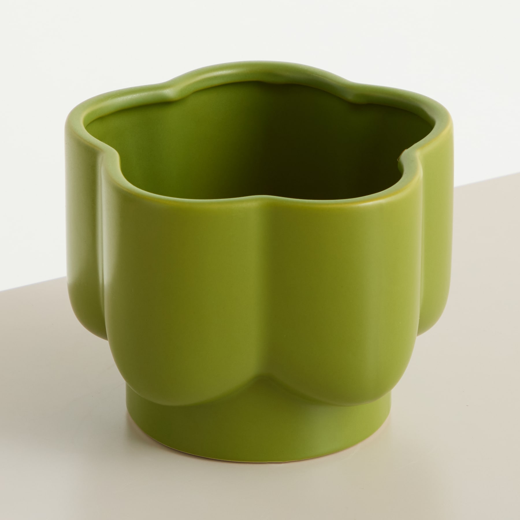 Der Keramik Übertopf Grün Blumenform fällt sofort durch seine ungewöhnliche Silhouette auf: Fünf sanft gerundete Ausbuchtungen formen eine blütenartige Struktur, die dem Übertopf eine lebendige Präsenz verleiht. Mit 14 cm Breite und 11 cm Höhe bietet er ausreichend Platz für Blumentöpfe und schafft gleichzeitig einen markanten Kontrast zu geradlinigen Möbeln. Sein zartes Grün wirkt frisch und modern, ohne aufdringlich zu sein. Die organische Form lädt dazu ein, den Übertopf als Solitär oder in Kombination mit anderen Vasen und Töpfen zu arrangieren – etwa auf dem Sideboard, der Fensterbank oder dem Couchtisch. Die glatte Oberfläche unterstreicht die klare Linienführung und macht ihn pflegeleicht. Dieser Übertopf ist funktional, ohne langweilig zu wirken, und setzt Akzente, ohne die Aufmerksamkeit zu dominieren. Einfach eine Pflanze einsetzen und die harmonische Verbindung von Form und Farbe genießen.
