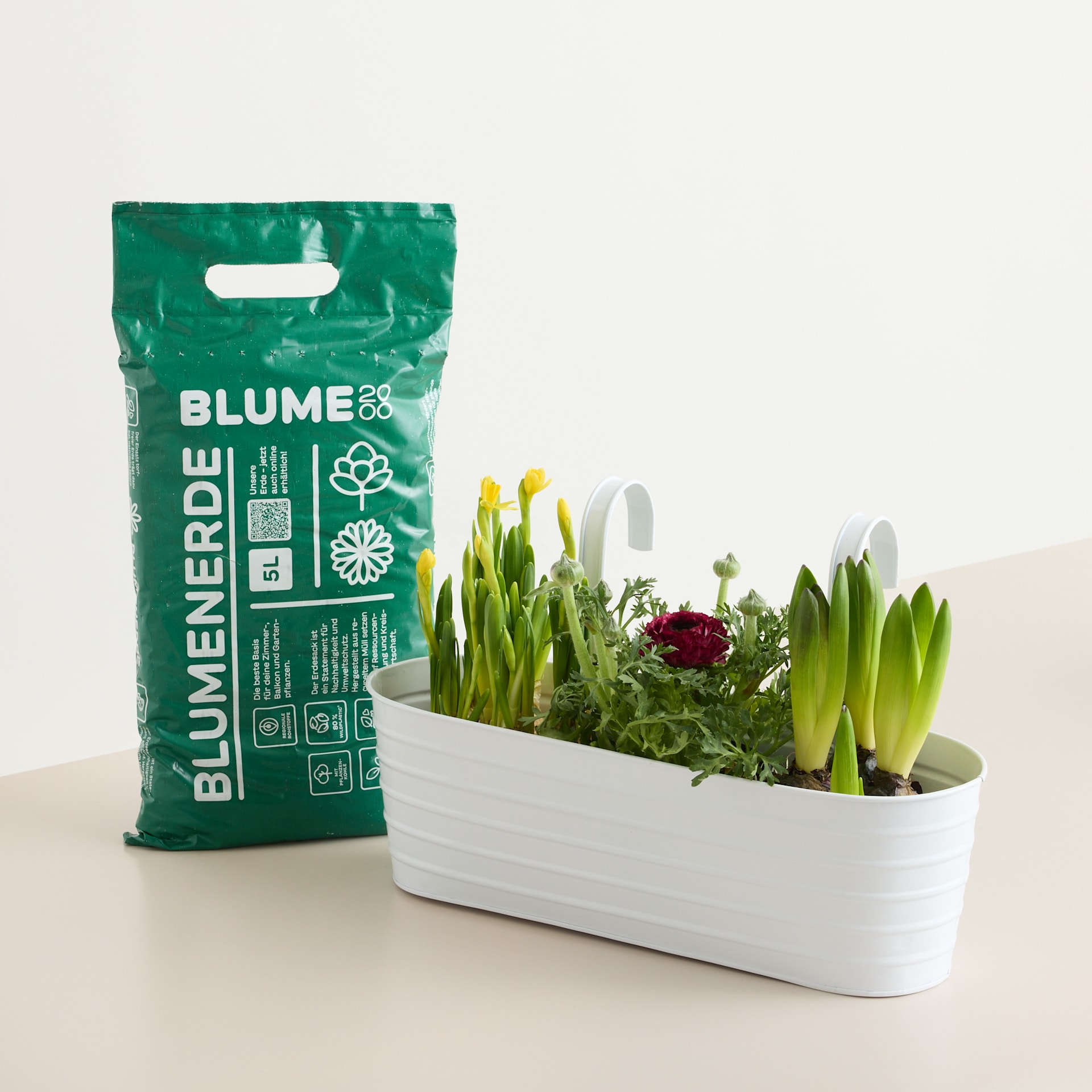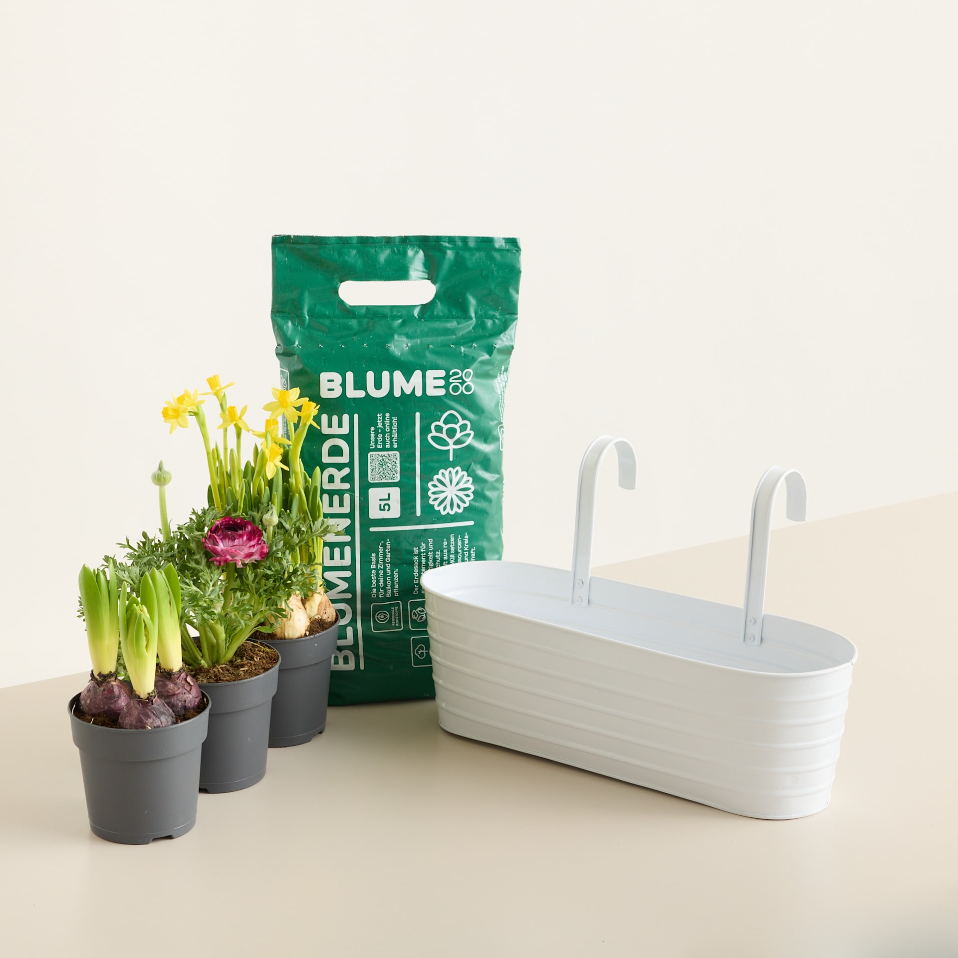 Zarter Frühlingstraum in Creme – das Balkonkasten Bundle Creme M bringt dezente Eleganz und natürliche Frische direkt auf deinen Balkon. Der Metall Hängekasten Rille Creme Groß verleiht deinem Außenbereich einen modernen, aber warmen Look. Gefüllt mit der hochwertigen BIO Blumenerde 5L finden die charmante Narzisse ‘Tete a tete’, eine duftende Hyazinthe in Zufallsfarbe und eine farbintensive Ranunkel in Pink das perfekte Zuhause. Das Balkonkasten Bundle Creme M vereint harmonische Farben und lebendige Blütenfreude zu einem stilvollen Gesamtbild. Ideal für sonnige bis halbschattige Plätze – mit regelmäßiger Bewässerung bleibt dein Frühlingsensemble gesund und blühfreudig. So verwandelst du deinen Balkon in eine kleine Wohlfühloase voller Charme und Natürlichkeit.