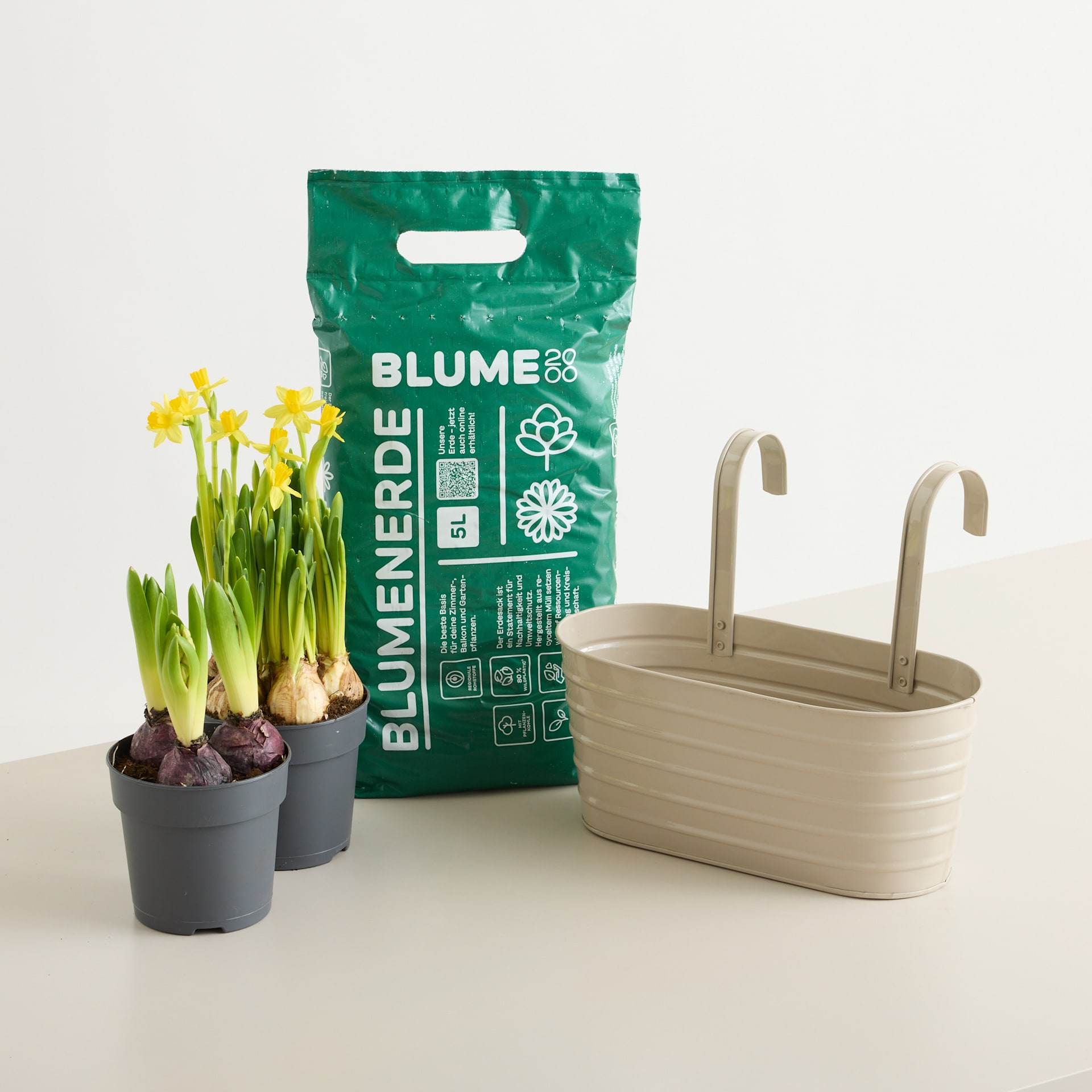 Elegante Zurückhaltung mit Charme – das Balkonkasten Bundle Taupe S bringt schlichte Schönheit und natürliche Frische auf deinen Balkon oder dein Fensterbrett. Der Metall Hängekasten Rille Taupe Klein überzeugt mit seiner modernen Linienstruktur und dem warmen, zeitlosen Farbton. In der BIO Blumenerde 5L entfalten die sonnige Narzisse ‘Tete a tete’ und eine duftende Hyazinthe in Zufallsfarbe ihre Blütenpracht und sorgen für sanfte Farbakzente, die perfekt mit dem dezenten Taupe harmonieren. Das Balkonkasten Bundle Taupe S ist ideal für alle, die eine feine, aber wirkungsvolle Frühlingsdekoration suchen. Bei regelmäßigem Gießen und einem sonnigen bis halbschattigen Standort bleibt dein kleines Blütenensemble gesund, frisch und immer ein echter Blickfang.