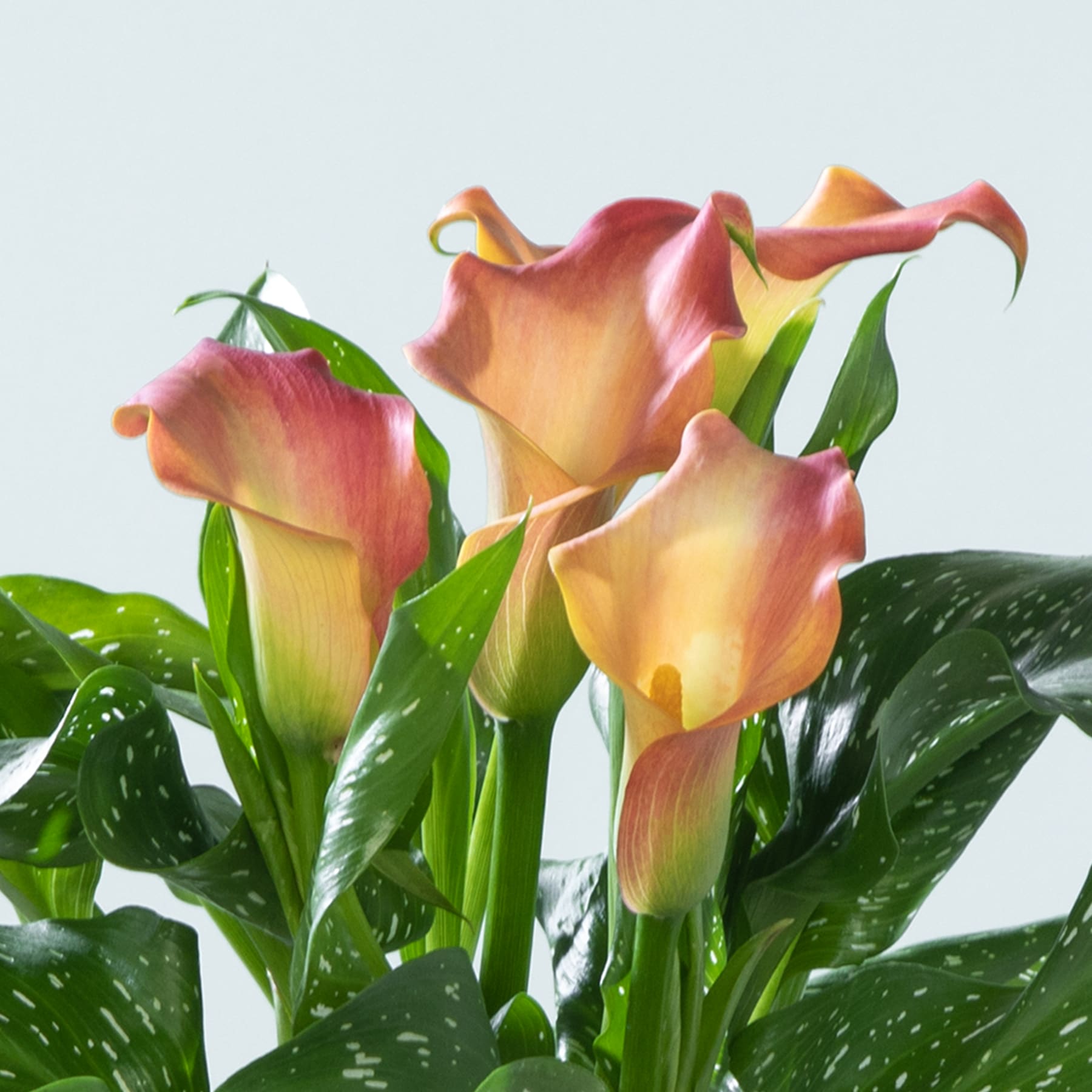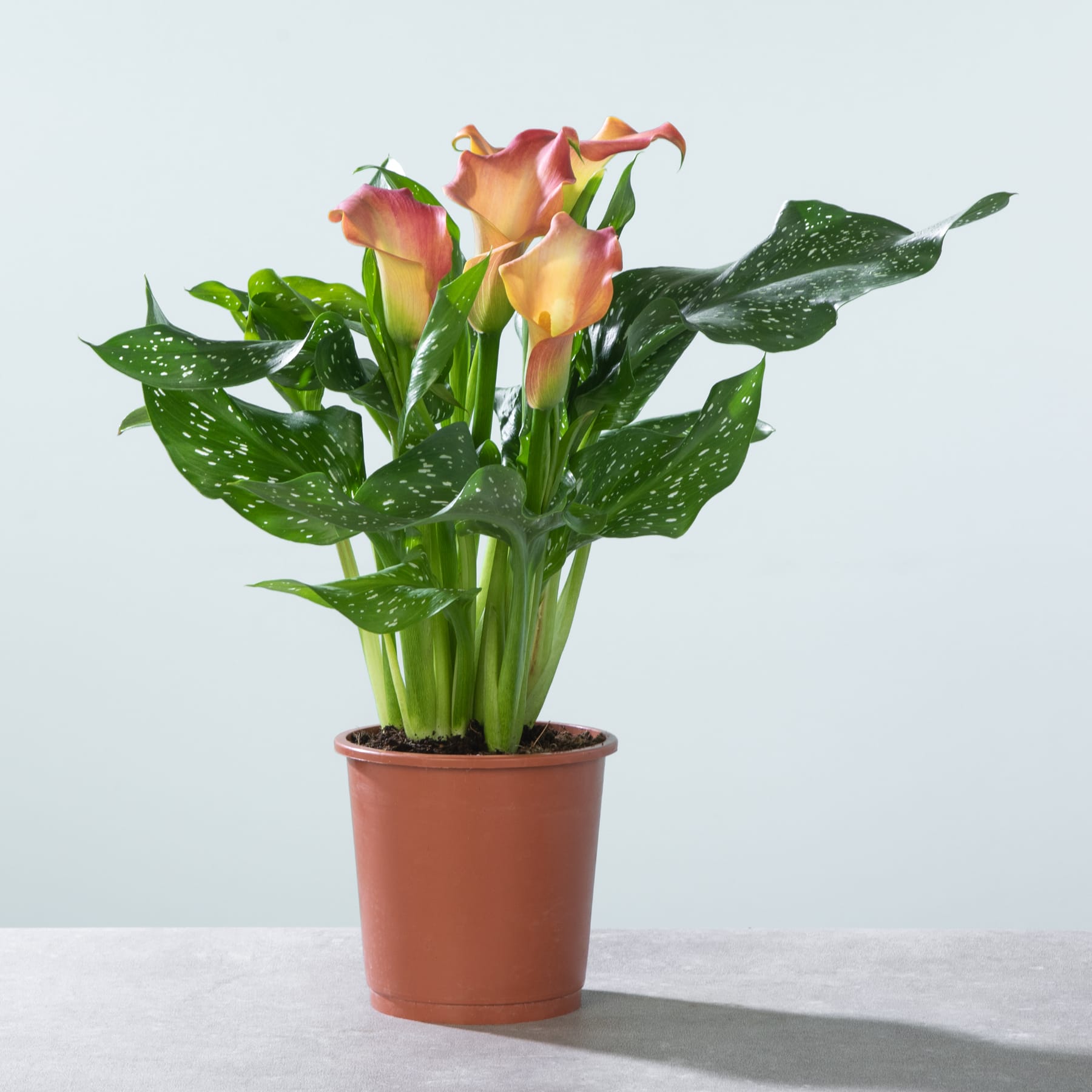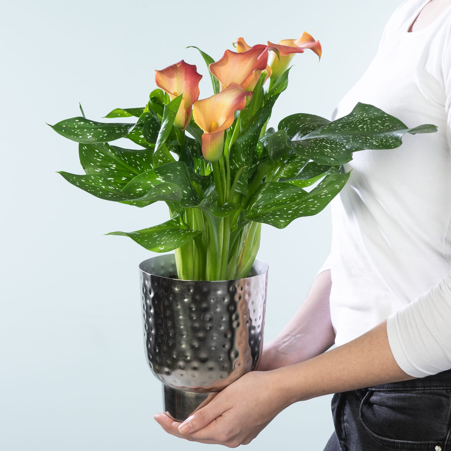 Diese Calla geht farblich einfach mal neue Wege und kombiniert zu ihren dunkelgrünen Blättern leuchtend orangefarbene Blüten. Ein Farb-Statement das sich zwischen Dezember und April als der Eyecatcher schlechthin in deiner Wohnung erweist. Diese selbstbewusste Vertreterin der Art Zantedeschia aethiopica ist eben eine richtige Trendsetterin, die es ganz nebenbei auf bis zu 50 cm Wuchshöhe und -breite bringen kann. Die Calla muss ausreichend gegossen werden. Wenn du darauf achtest, dass die Erde immer feucht ist, belohnt sie dich mit kräftigem Wuchs. Am besten kann sie das an einem hellen Standort. Die pralle Sonne mag sie nicht so gerne.