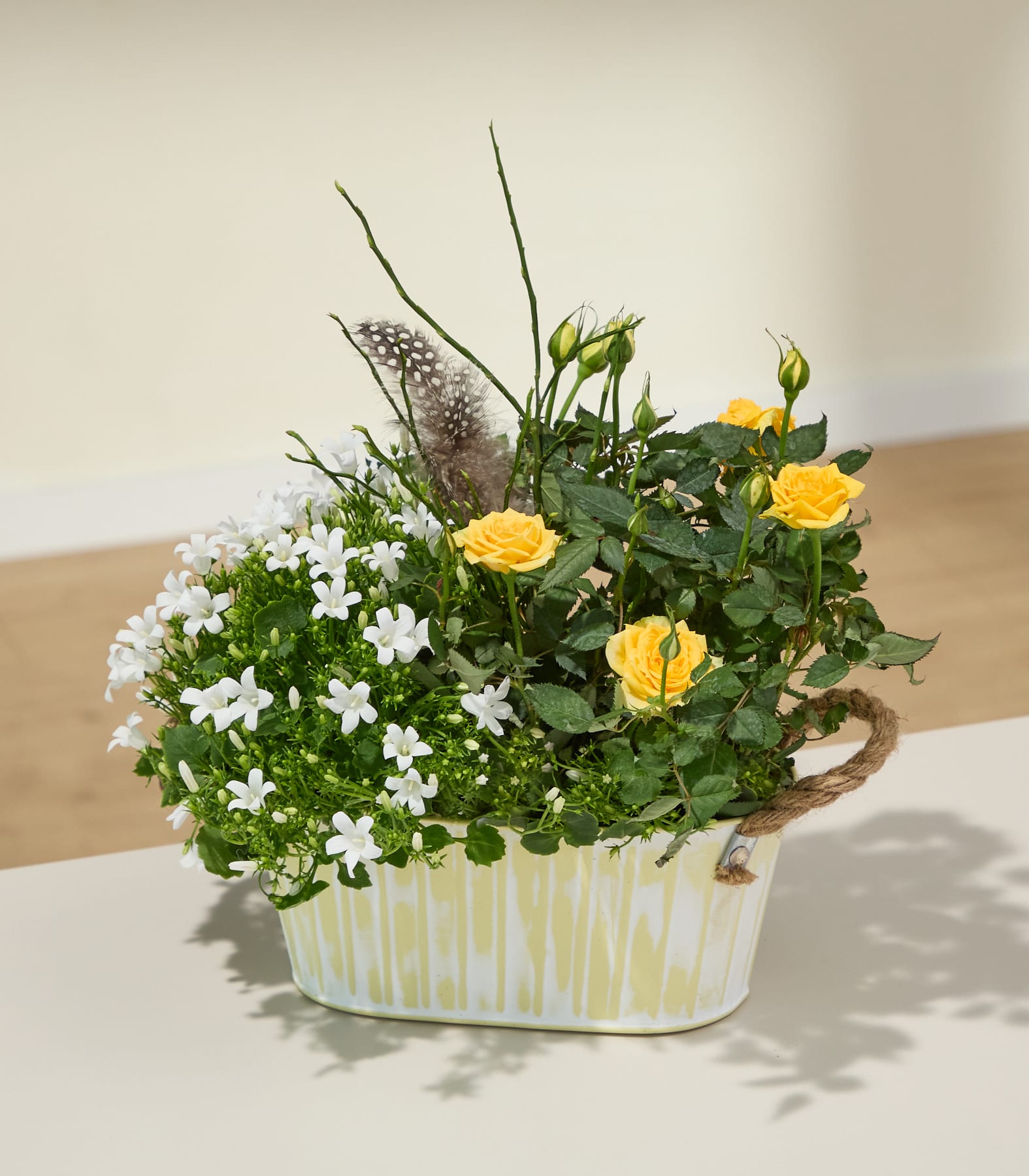 Weiß, Gelb und Grün sind die dominierenden Farben unseres beeindruckenden Pflanzenarrangements Federspiel mit dem Lindt Osterei. Es besteht aus einer zart duftenden Rose in erfrischendem Gelb und einer pflegeleichten Campanula mit weißen Blüten in Glockenform. Die hübschen Pflanzen befinden sich in einem dekorativen Übertopf mit einer Topfgröße von ca. 22 cm. Die Wuchshöhe beträgt etwa 30 cm. Du kannst das Arrangement auf einem Tisch oder einer Fensterbank platzieren, noch wohler fühlt es sich jedoch auf dem Balkon oder der Terrasse. Gönne dem Set einen sonnigen bis halbschattigen Standort und versorge die Blumen regelmäßig mit frischem Wasser. Achte jedoch darauf, dass keine Staunässe entsteht. Die Pflanzen sind winterhart und dürfen später direkt ins Beet umziehen.