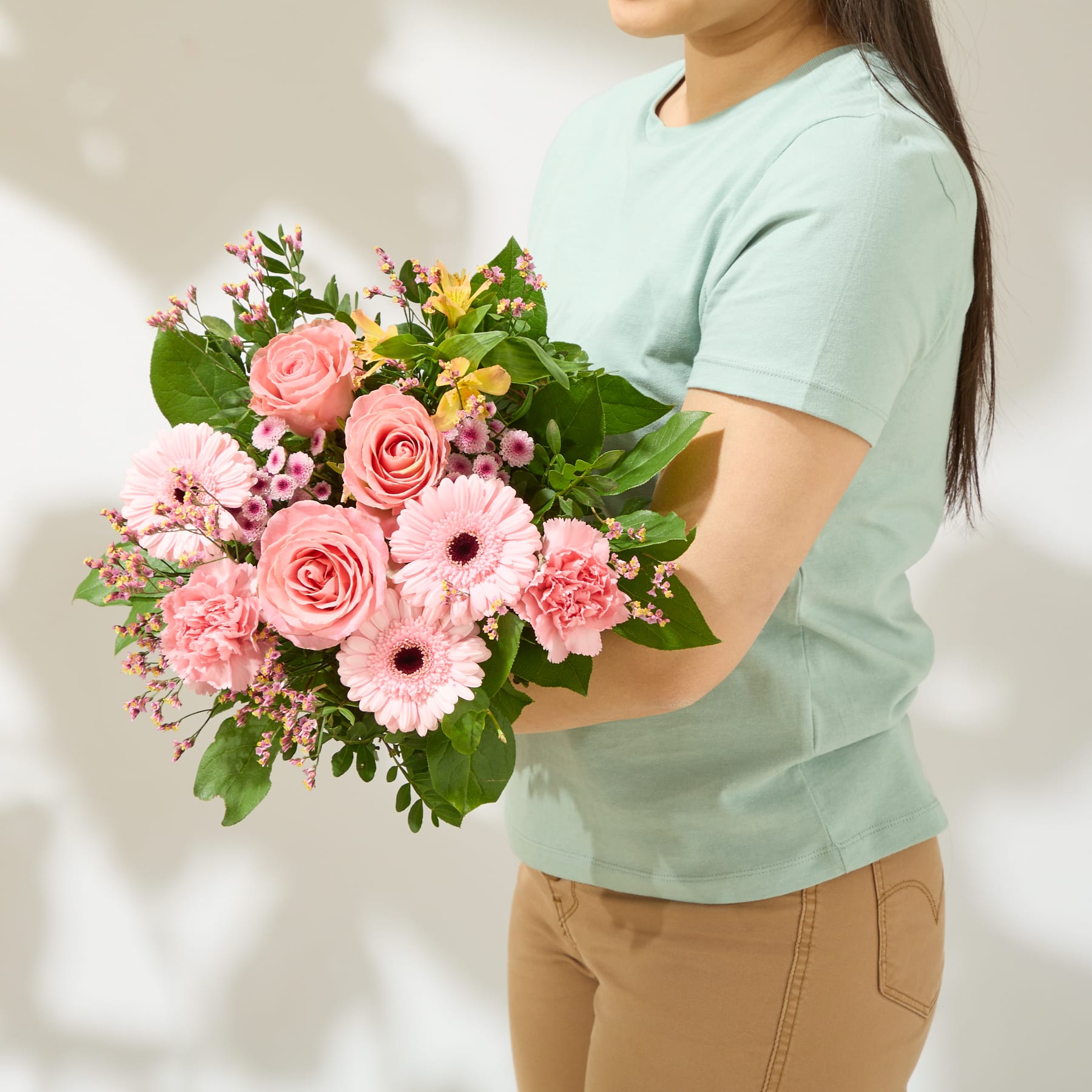 Manchmal braucht es nur einen Hauch Pink, um den Frühling spürbar zu machen. In diesem Strauß stehen Alstromerien im Mittelpunkt – Blumen, die als Symbol für Freundschaft und Beständigkeit gelten. Ihre feinen Blüten öffnen sich nach und nach und sorgen so für langanhaltende Freude. Umspielt von Rosen, Nelken und Chrysanthemen entsteht ein harmonisches Farbspiel aus Rosé und Pink, das Leichtigkeit und Wärme ausstrahlt. Salal und Pistazie bringen Frische, während Limonium zarte Akzente setzt. Mit einem Durchmesser von ca. 25 cm ist unser Strauß Think Pink perfekt für kleine Glücksmomente im Alltag. Ein Strauß, der leise verzaubert – und dabei lange in Erinnerung bleibt.