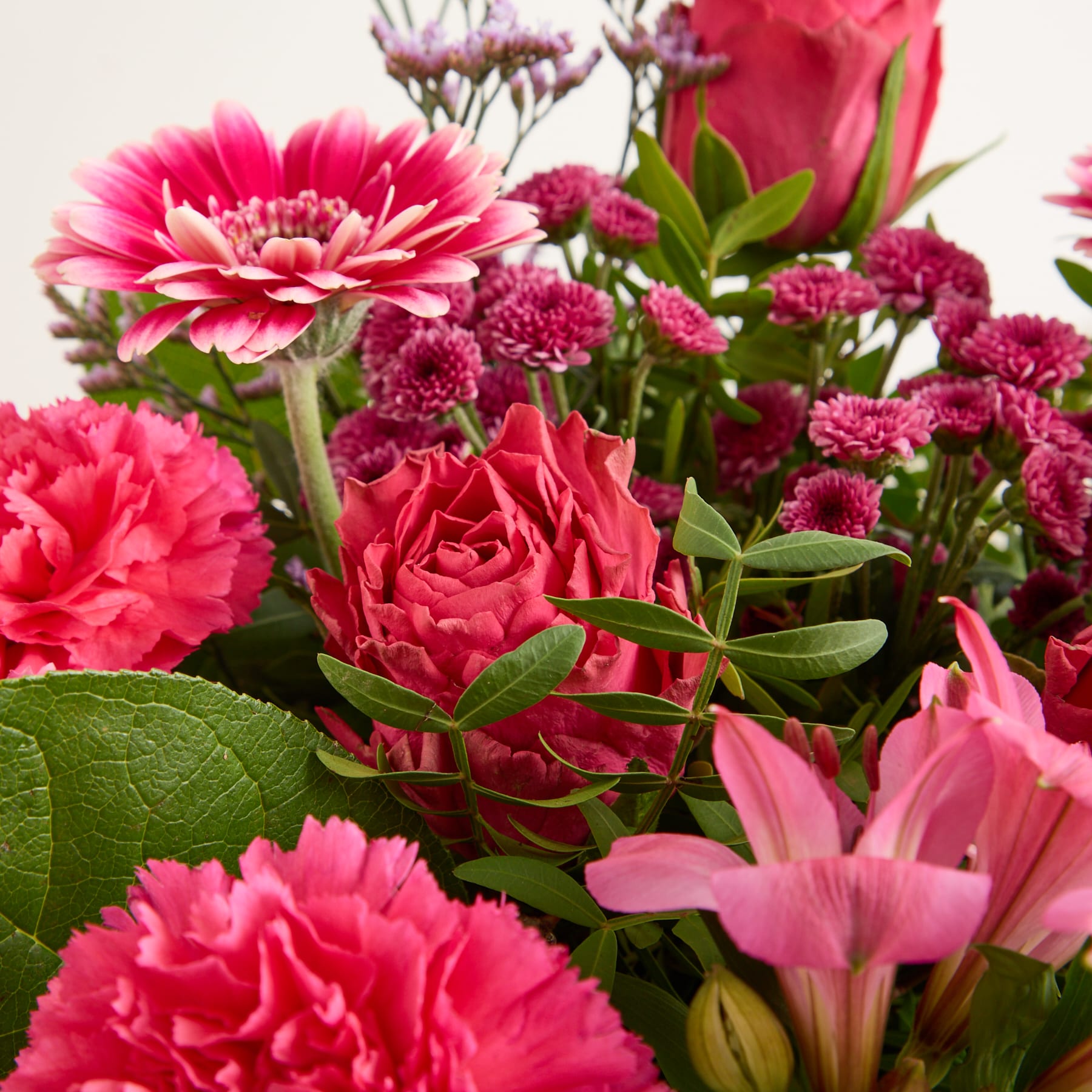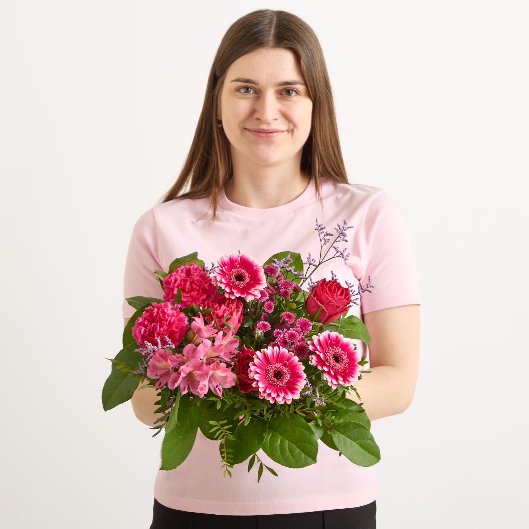 Pink Flower bringt frische Energie in die Wintermonate und leuchtet wie ein freundliches Lächeln. Die zarten Alstromerien stehen für Verbundenheit, während Nelken und Rosen eine romantische Weichheit erzeugen. Chrysanthemen schenken Volumen und Langlebigkeit, und die Gerbera setzt einen fröhlichen Mittelpunkt. Salal und Pistazie geben dem Strauß seine natürliche Form, Limonium legt sich wie ein feiner, winterlicher Hauch darüber. In Pinktönen arrangiert, wirkt dieses handgebundene Bouquet modern, herzlich und verspielt. Mit 30 cm Stiellänge passt es wunderbar auf Sideboards oder kleine Tische. Ein liebevoller Gruß für all jene, denen du Wärme, Anerkennung und ein Stück florale Freude schenken möchtest!