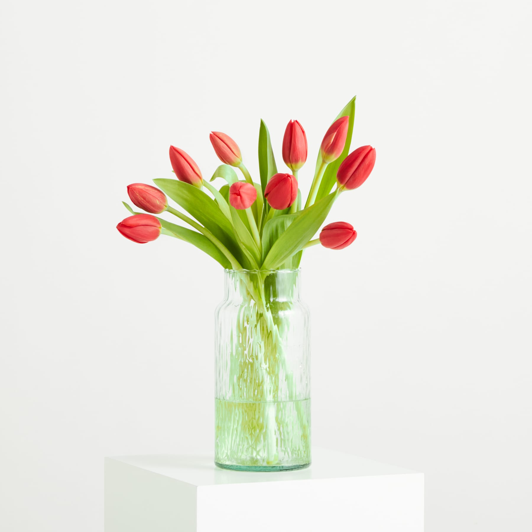 Kraftvoll, leidenschaftlich, unvergesslich – rote Tulpen sind ein Klassiker, der nie aus der Mode kommt. Zehn leuchtend rote Stiele in der Vase setzen ein klares Statement und verleihen deinem Zuhause sofortige Strahlkraft. Die rote Tulpe ist eine der bekanntesten Blumen überhaupt, ursprünglich aus Zentralasien, heute ein Symbol für Lebensfreude und Schönheit. Ihr aufrechter Wuchs und die samtigen Blütenblätter machen sie zu einem echten Hingucker auf dem Esstisch oder Sideboard. Kombiniere sie mit weißen Tulpen für einen klassischen Kontrast oder stelle ein paar Zweige Heidelbeere dazu, um Tiefe zu erzeugen. Mit roten Tulpen machst du es dir selbst zu Hause wirklich schön!