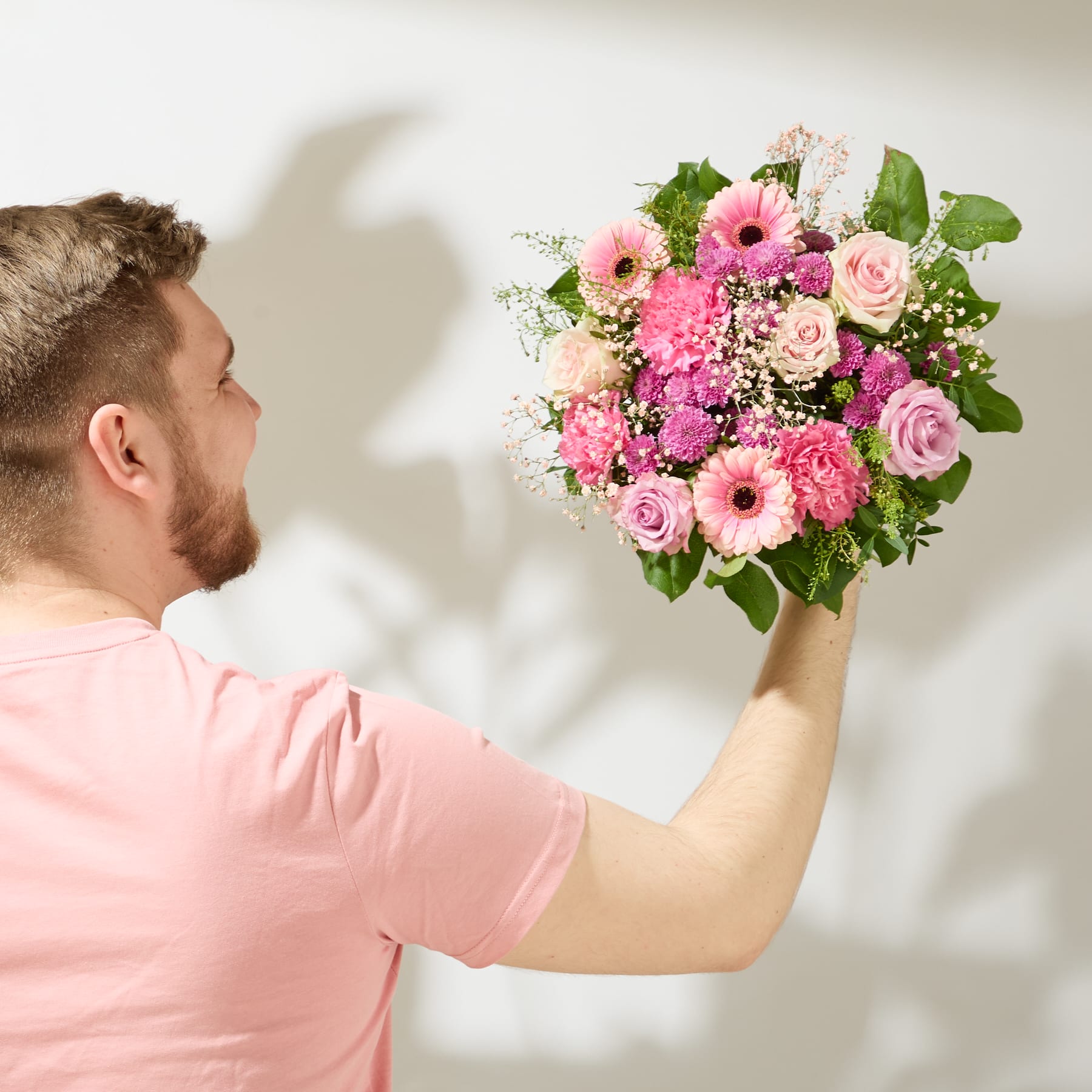 Wie ein sanfter Morgen im April wirkt dieser Strauß voller Leichtigkeit. Besonders Gerbera ziehen alle Blicke auf sich: Ihre offene Blütenform steht für Lebensfreude und Optimismus. In zartem Rosé fügen sie sich wunderbar zwischen Rosen, Nelken und Chrysanthemen ein. Schleierkraut sorgt für luftige Akzente, während Thlaspi und Salal dem Arrangement Natürlichkeit verleihen. Mit einem Durchmesser von rund 30 cm entfaltet unser Strauß Frühlingserwachen eine ruhige, elegante Wirkung. Gerbera reagieren übrigens besonders sensibel auf Licht – sie richten sich danach aus und wirken dadurch fast lebendig. Ein Strauß, der den Frühling nicht nur zeigt, sondern fühlbar macht.
