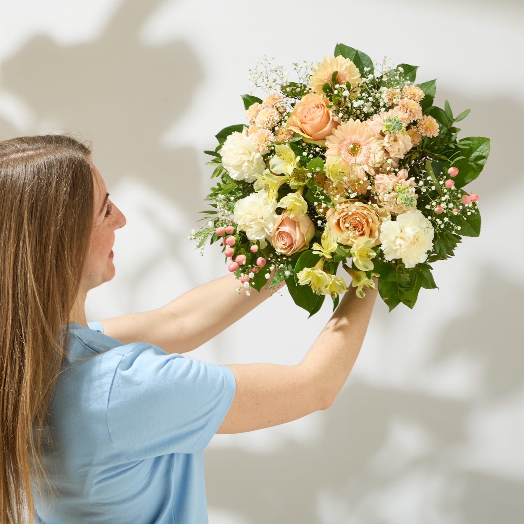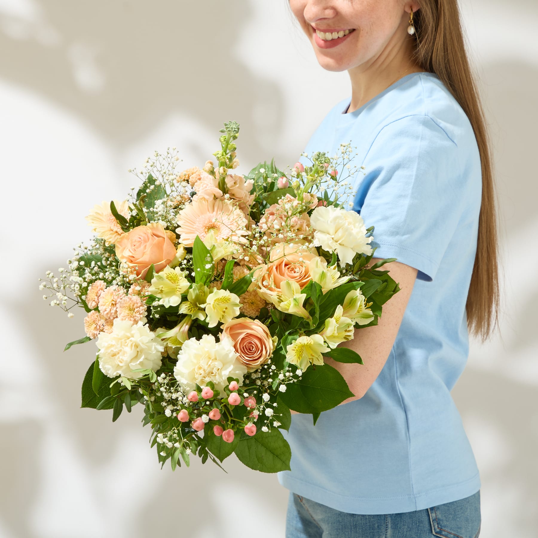 Warme Orangetöne treffen auf frisches Weiß – ein Zusammenspiel, das sofort gute Laune macht. Im Mittelpunkt stehen Levkojen, die nicht nur durch ihre strukturierte Blüte, sondern auch durch ihren zarten Duft begeistern. Umrahmt von Rosen, Gerbera und Alstromerien entsteht ein ausdrucksstarker Strauß mit ca. 32 cm Durchmesser. Schleierkraut und Johanniskraut lockern das Arrangement auf, während Salal und Pistazie für grüne Frische sorgen. Sweet Spring bringt sonnige Energie in jeden Raum und erinnert daran, wie schön der Frühling duften kann.