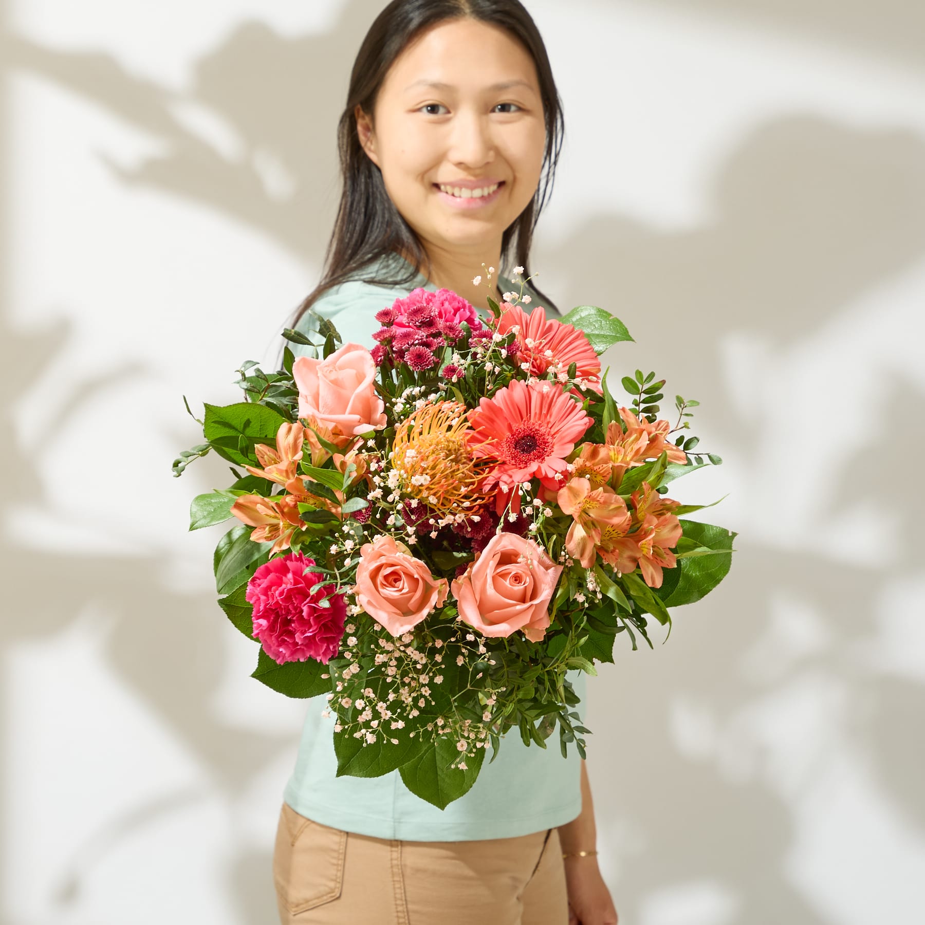 Dieser Blumenbund sprüht vor Lebensfreude. Besonders Alstromerien prägen das Bild: Ihre filigranen Blüten stehen für Freundschaft und Offenheit. In Rosé- und Orangetönen wirken sie lebendig und warm zugleich. Gerbera, Chrysanthemen und Rosen ergänzen den Look, während das Nadelkissen Protea einen spannenden Akzent setzt. Mit einer Stiellänge von rund 30 cm lässt sich der Blumenstrauß Happy Spring perfekt an alle verschenken, die sich am Frühling erfreuen. Alstromerien öffnen sich nach und nach – so wächst der Strauß mit jedem Tag ein bisschen weiter. Ein fröhlicher Begleiter für sonnige Frühlingstage.