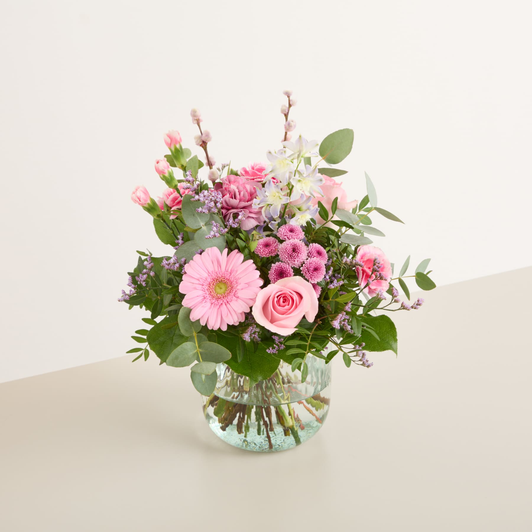 Ein zarter Strauß, der mit liebevoller Zurückhaltung große Wirkung zeigt. Nelken und Rosen bilden das weich-romantische Herz, während Chrysanthemen für Fülle und gute Haltbarkeit stehen. Rittersporn bringt elegante Höhe und einen Hauch Natürlichkeit ein, ergänzt durch die feinen Zweige von Salix, die an winterliche Landschaften erinnern. Eukalyptus schenkt moderne Frische, und Limonium rundet das Bouquet mit zarter Struktur ab. Salal verleiht dem Arrangement seinen natürlichen Rahmen. Mit etwa 35 cm Stiellänge wirkt der kleine Gruß ausdrucksstark – ein liebevoller Wintergruß, der sagt: „Ich denke an dich“ und mit seiner Rosépalette Wärme in jedes Zuhause bringt!