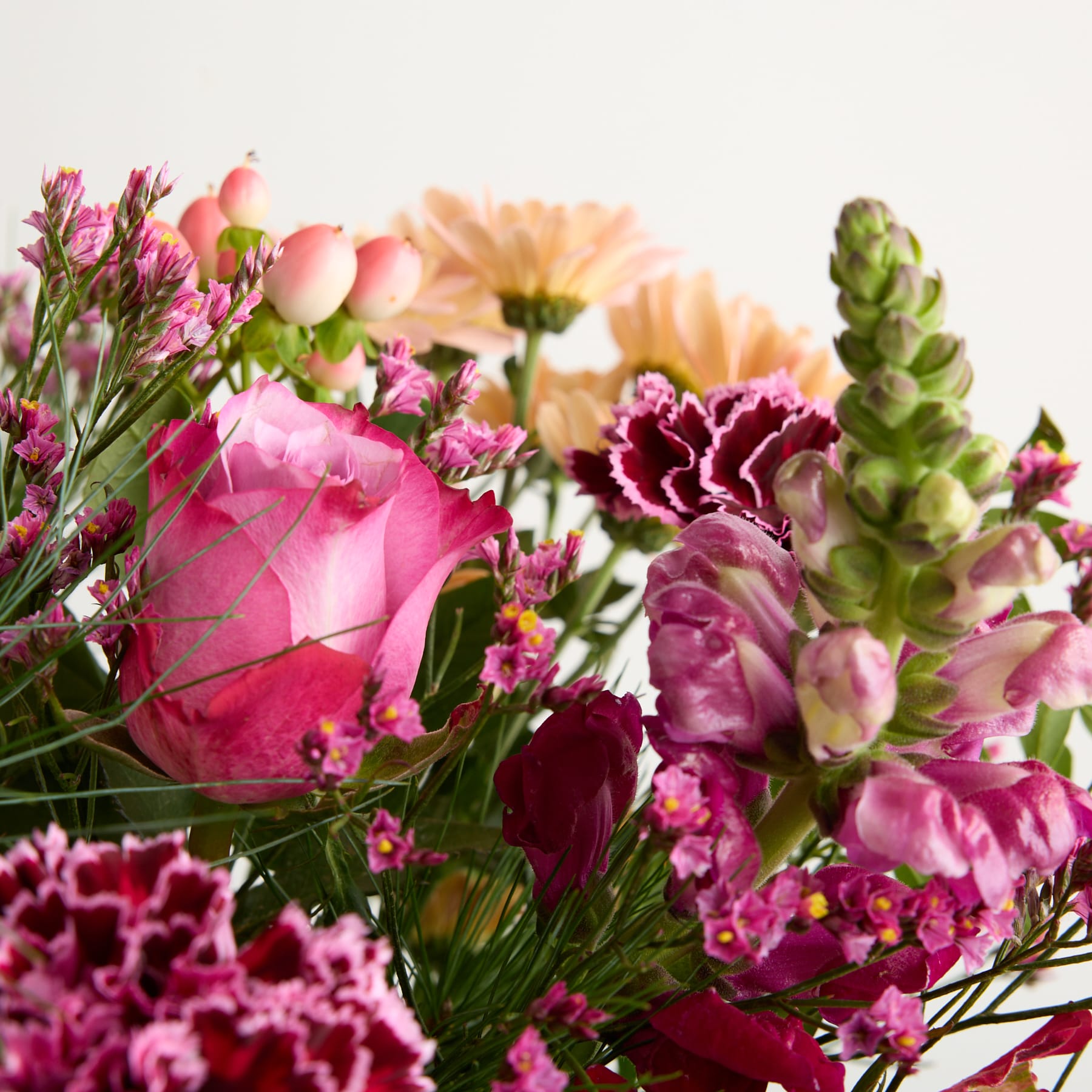 Wintermärchen – ein Wiesenblumenstrauß wie aus einem zauberhaften Wintertraum. Zarte Rosen und Nelken vereinen sich mit filigranem Löwenmaul und Chrysanthemen zu einem Arrangement voller Eleganz und Wärme. Edles Leucadendron und feines Limonium bringen winterliche Struktur, während duftendes Kieferngrün und Pistazie an Spaziergänge durch verschneite Wälder erinnern. Kleine Beeren des Johanniskrauts setzen leuchtende Akzente – wie winzige Glanzpunkte im Kerzenlicht. Ein liebevoll zusammengestellter Strauß, der Herz und Sinne berührt und die Magie der Weihnachtszeit in jedes Zuhause bringt – perfekt, um deinen Liebsten Freude, Geborgenheit und winterliche Träumerei zu schenken.