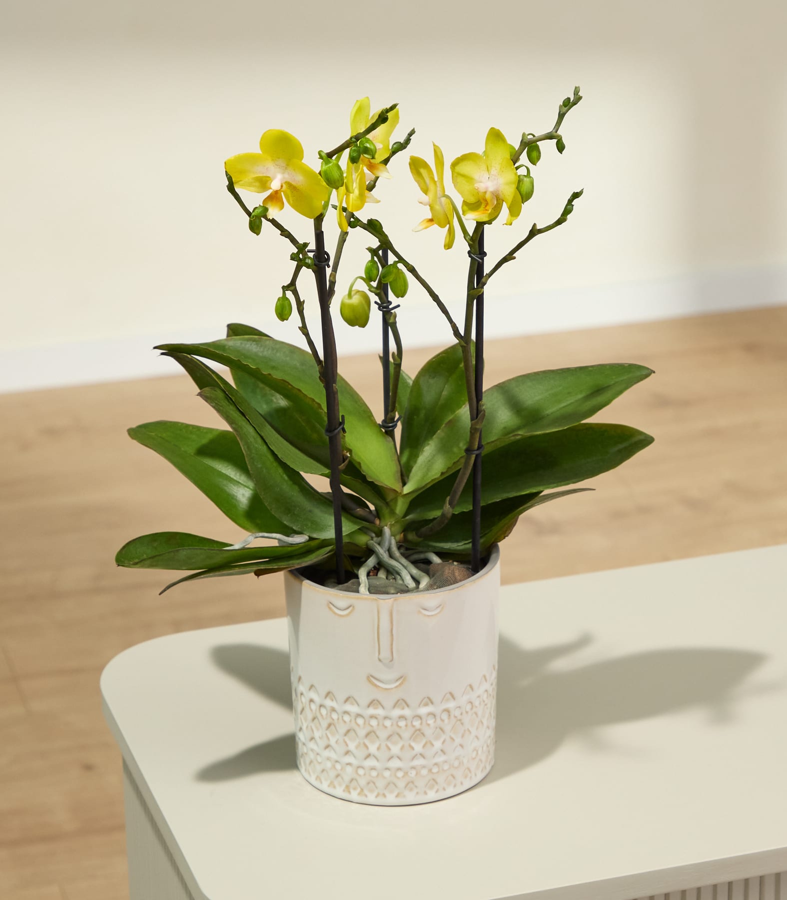 Mit einer Wuchshöhe von ca. 50 cm und einer Topfgröße von ca. 12 cm setzt sie einen stilvollen Akzent auf Tisch oder Fensterbank. Der charmante Keramik-Übertopf mit Gesicht verleiht dem Arrangement eine verspielte, persönliche Note. Orchideen lieben helle Standorte ohne direkte Sonne und danken dir bei maßvollem Gießen mit langanhaltender Blütenpracht. Ein goldenes Frühlingsgeschenk, das von Herzen kommt und lange Freude schenkt.