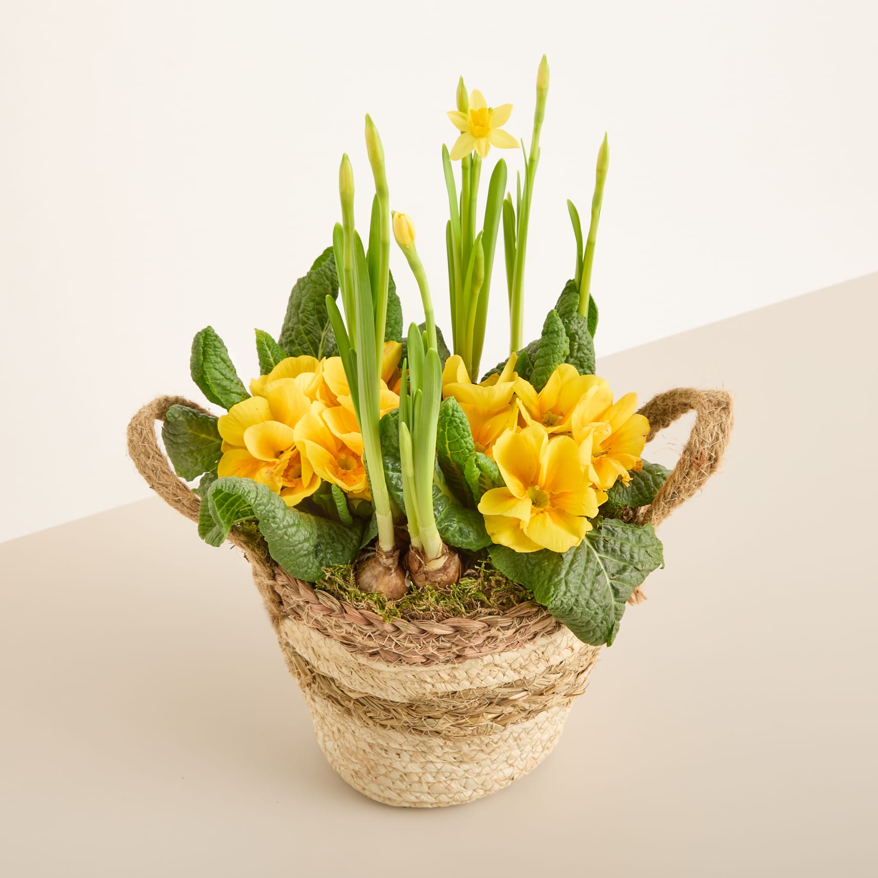 Hurra, der Frühling ist da und mit ihm die ersten Blumen des Jahres. Damit du sie dir direkt zu deinen Liebsten holen kannst, haben wir für dich das Arrangement Frühlingsflirt zusammengestellt. Der Topf mit 20 cm Durchmesser enthält Narzissen und leuchtend gelbe Primeln. Alles zusammen befindet sich in einem hübschen Henkelkorb, der sich auch prima verschenken lässt. Die Wuchshöhe liegt bei etwa 26 cm. Du kannst den Topf im Wohnraum oder auch im Außenbereich platzieren. Je wärmer es ist, desto früher entfalten sich die Blüten. Die Bepflanzung kannst du später nach draußen pflanzen. Abgesehen von der Bornholmer Margerite sind alle Pflanzen winterhart.
