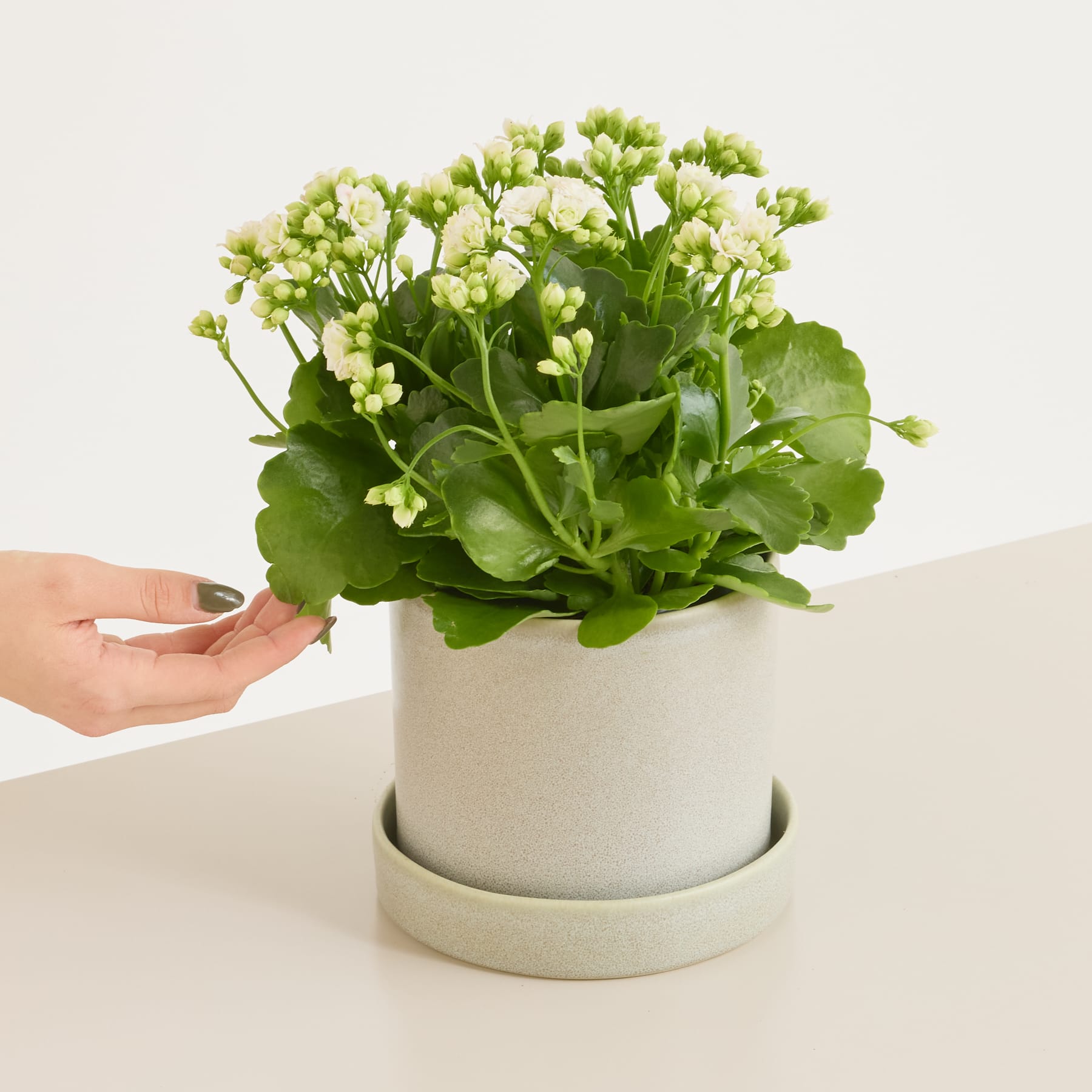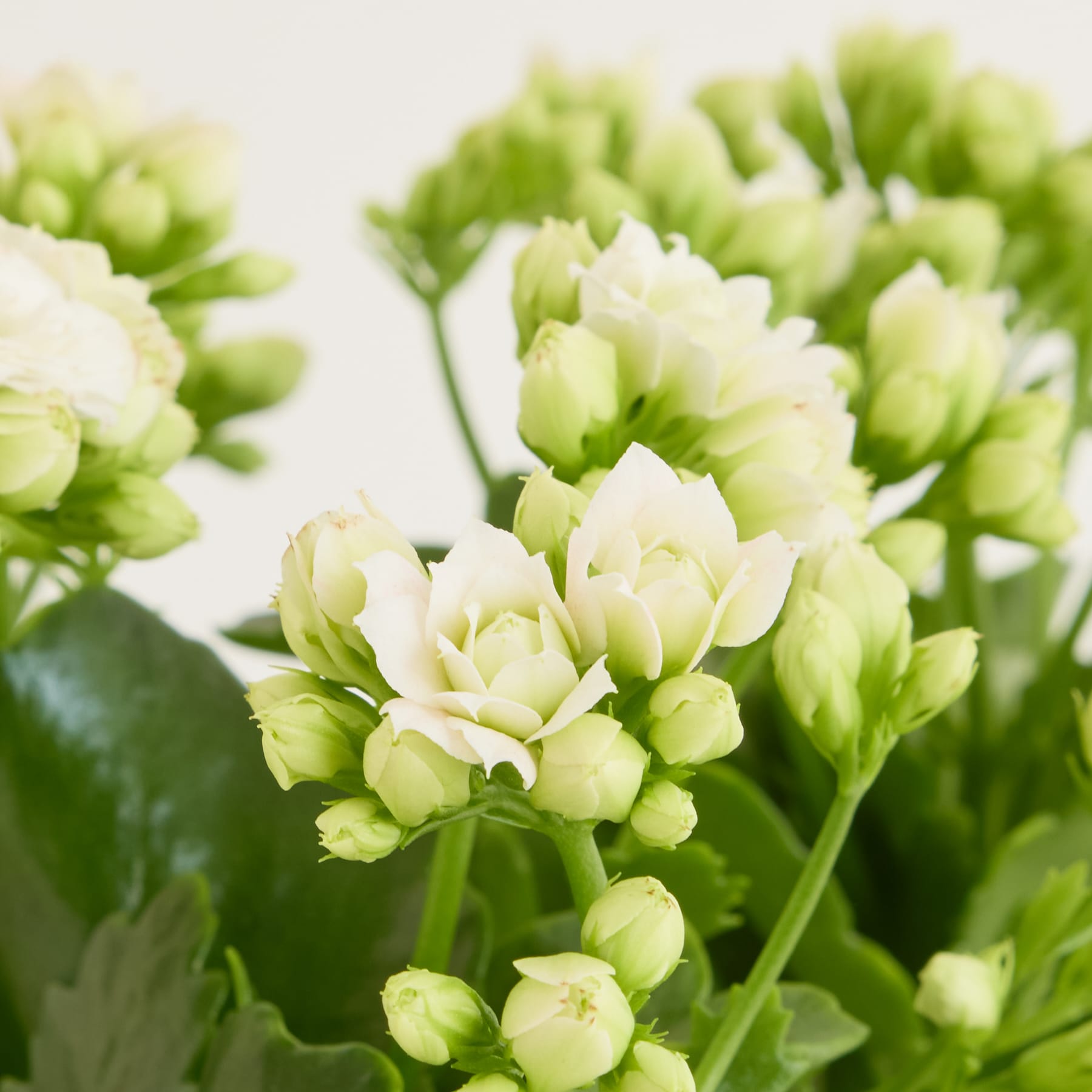 Kalanchoe blossfeldiana, du weißt natürlich sofort, dass sich hinter diesem botanischen Namen das Flammende Käthchen verbirgt. Diese hier ist sogar eine kleine Diva, genauer gesagt eine Kalanchoe 'Calandiva'! Sie hat alles, was ein Flammendes Käthchen haben muss: einen aufrechten Wuchs, der sie bis zu 30 cm groß und 20 cm breit werden lässt, dickfleischige, dunkelgrüne Blätter und natürlich sternförmige Blüten. Und da macht sich die Diva bemerkbar, denn sie sind nicht einfach nur strahlend weiß, sondern auch noch raffiniert gefüllt.Das Flammende Käthchen 'Calandiva' hat zwar die Diva im Namen, ist aber einfach im Umgang. Wenn du darauf achtest, dass die Erde immer leicht feucht ist, belohnt es dich mit kräftigem Wuchs. Am besten kann es das an einem hellen Standort. Die pralle Sonne mag es nicht so gerne.