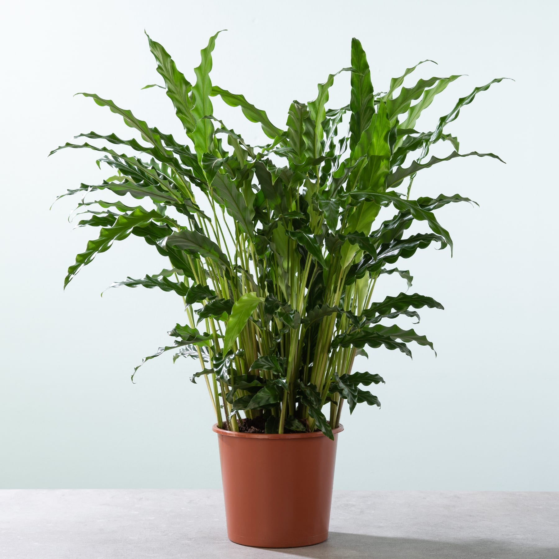 Sanft, elegant und doch außergewöhnlich – die Calathea 'Miroscha' verzaubert mit filigranen Blattzeichnungen und samtiger Struktur. Ihr lebendiges Grün wirkt beruhigend und schafft eine natürliche Oase im Raum. Diese Korbmaranthe gedeiht am besten an halbschattigen Orten mit hoher Luftfeuchtigkeit und gleichmäßig feuchter Erde. Ihre Blätter bewegen sich im Tagesrhythmus – ein stilles Schauspiel der Natur. Die Calathea 'Miroscha' verbindet Schönheit mit Leichtigkeit und ist perfekt, um deinem Zuhause eine grüne, entspannte Atmosphäre zu schenken.