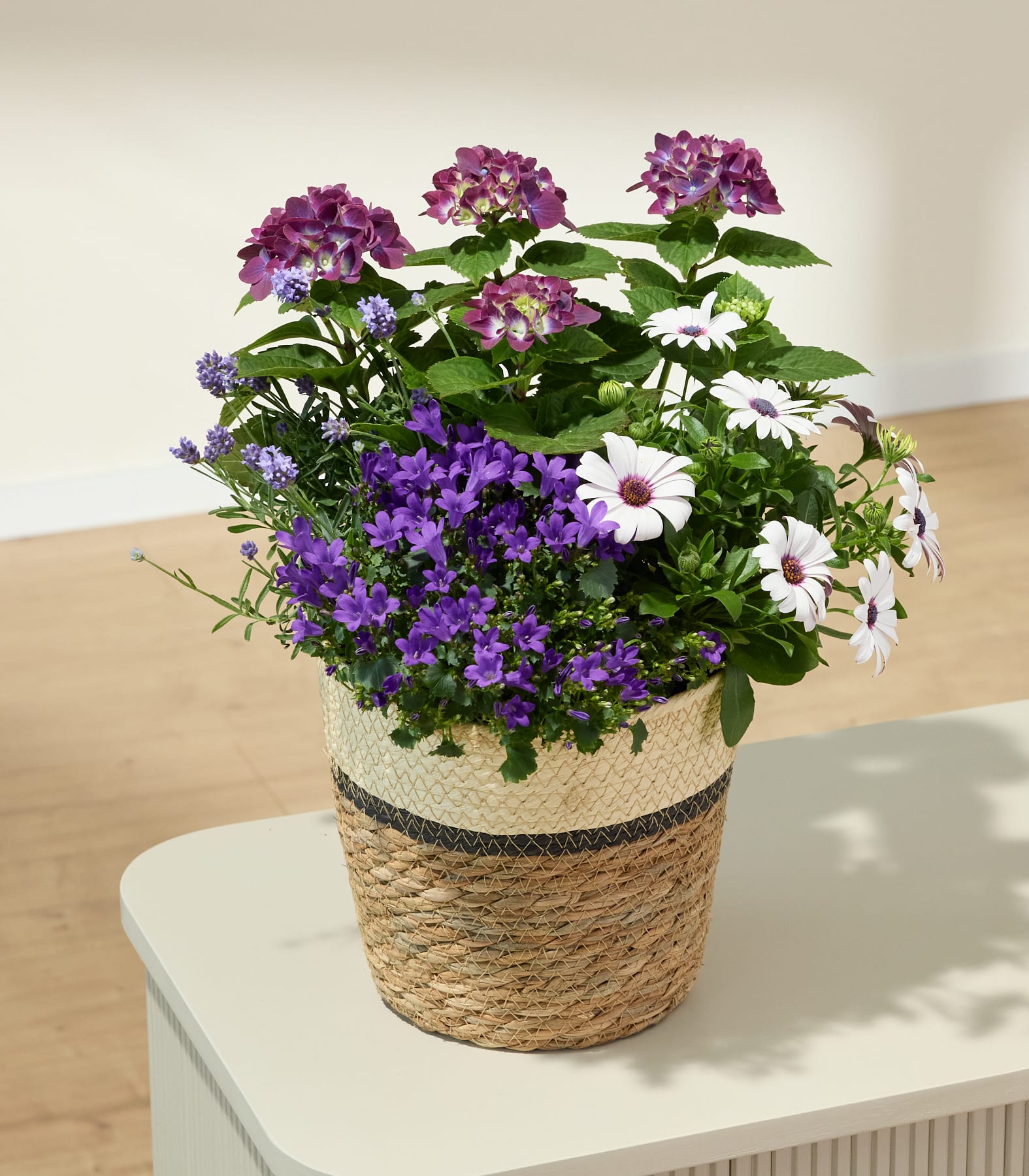 Natürlich schön, stilvoll und voller Frühlingsenergie: Unsere Pflanze im Krob Natural Beauty vereint Glockenblume, Hortensie, Lavendel und Margerite zu einem harmonischen Blütenensemble. In sanften Lila- und Weißtönen strahlt sie Ruhe und Eleganz aus. Mit einer Wuchshöhe von ca. 45 cm und ihrer pflegeleichten Art ist sie perfekt für helle Outdoorplätze geeignet – und dank Winterhärte ein Geschenk mit Beständigkeit. Diese Pflanze ist wie gemacht für Menschen, die Natürlichkeit lieben und sich ein Stück Gartenromantik wünschen. Ob als liebevolle Geste oder kleine Aufmerksamkeit: Natural Beauty bringt Frische, Duft und ein Gefühl von Zuhause – ganz ohne großen Pflegeaufwand.