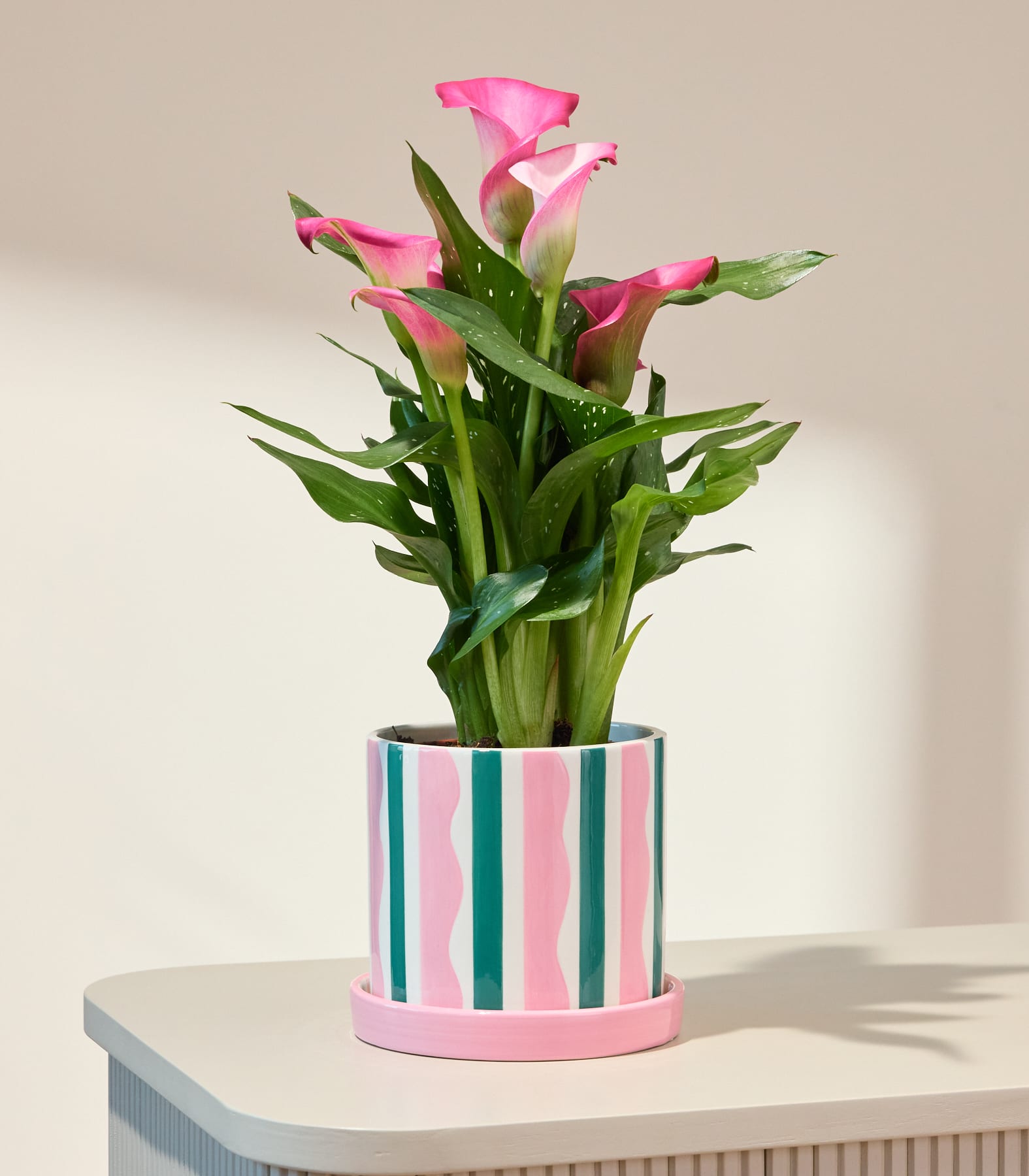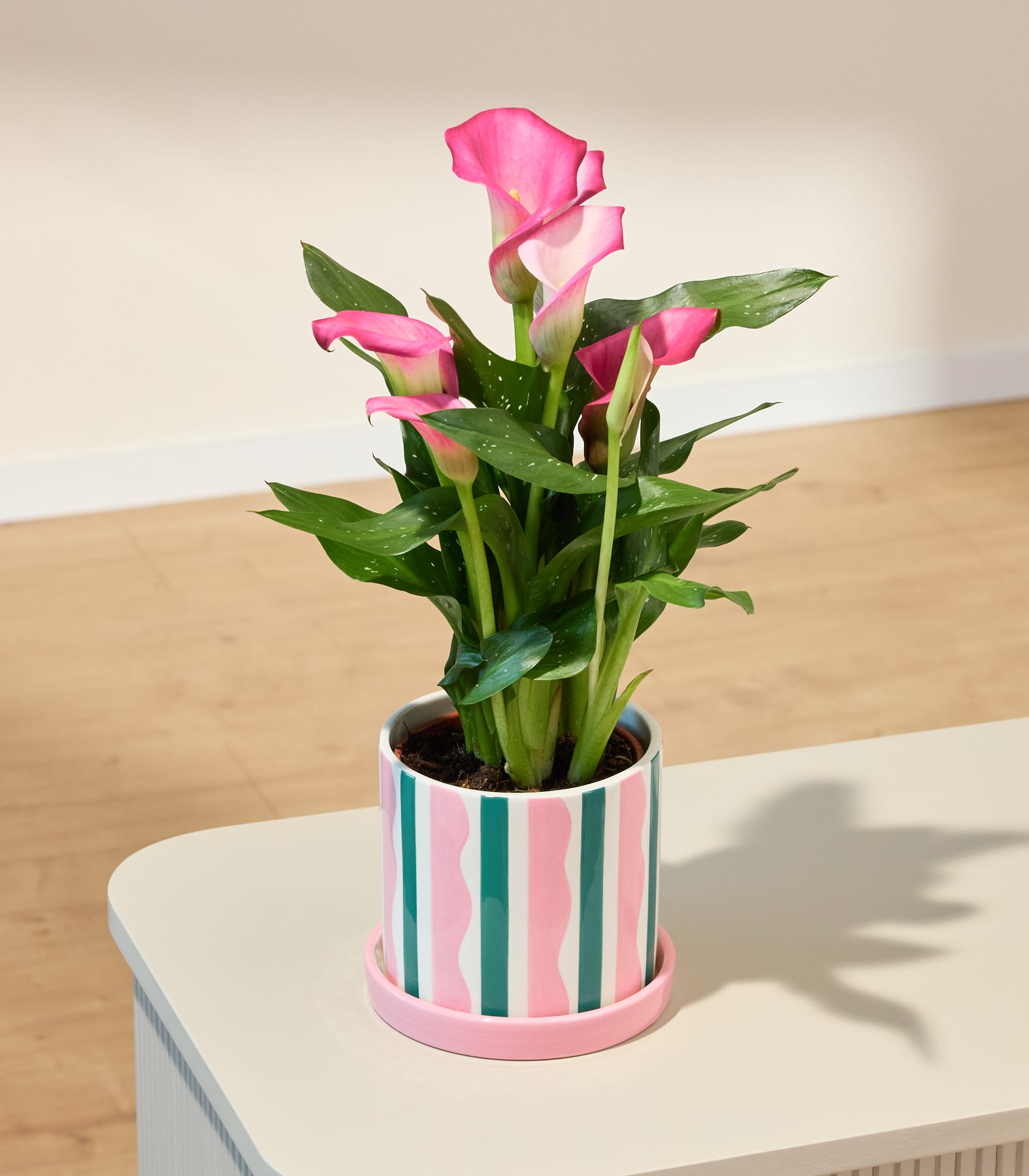 Unsere Blühpflanze im Topf Pink Kiss begeistert mit ihrer eleganten Calla und intensiven Pinktönen. Mit etwa 40 cm Höhe setzt sie stilvolle Akzente im Wohnzimmer und liebt helle Standorte. Ihre moderne Ausstrahlung macht sie zum perfekten Geschenk für Menschen mit Sinn für Design und Ästhetik. Die klaren Linien der Blüten wirken edel und gleichzeitig verspielt – ein spannender Kontrast, der sofort ins Auge fällt. Ob als Überraschung für die beste Freundin oder als liebevolle Aufmerksamkeit für zwischendurch: Die Calla Pink Kiss bringt Frische, Stil und eine Extraportion Charme in jeden Raum.